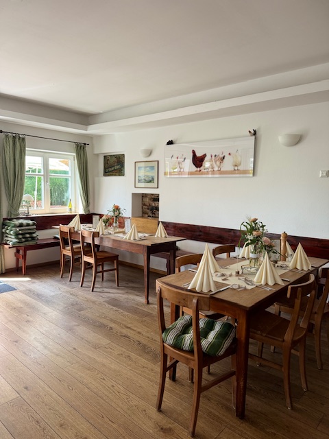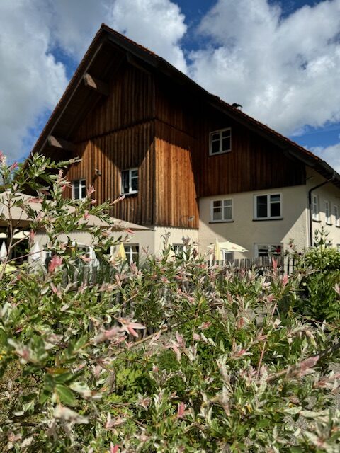 Direkt an der Straße Leutkirch – Isny. Gegenüber einer Bushaltestelle. Und erreichbar auch über den Fahrradweg Leutkirch-Urlau. Sowohl ein großer Parkplatz als auch eine Elektro-Ladestelle bieten hier Halt. Drinnen ein vielseitiger Eindruck. Die Inneneinrichtung regt zur Frage an, ob die gemütliche Gaststube alt oder neu ist. Beides. Denn Familie Pferdt hatte das Wirtshaus 2006 gekauft. Zuvor war es gut 20 Jahre lang leer gestanden, erzählt Wirtin Milena Pferdt. Danach versuchten die Pferdts, die alte Gaststube “so gut wie möglich zu erhalten”. Und doch auch zu erweitern. “Nicht so hartkantig”, aber mit Platz. So fanden auch die neuen Toiletten innerhalb des Gebäudes Raum. Vor 25 Jahren musste noch nach draußen, wer das “stille Örtchen” erreichen wollte.