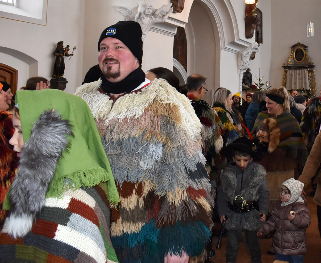 Gebrazhofen – Wie jedes Jahr hatte die Narrenvereinigung Gebrazhofen am Sonntag (11.1.) zur bunten Narrenmesse in die Kirche eingeladen. Die verschiedenen Gruppen wie Dickköpf, Waasenmoosweible und – male oder Blumennarren marschierten samt Fahnenträger und ihrem Narrensamen ein, legten ihre Masken vor dem Altar nieder, und die Musikkapelle Gebrazhofen spielte flotte Weisen.