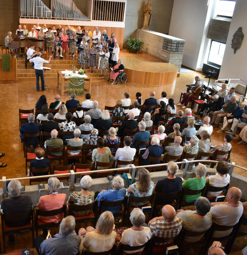 Leutkirch – Fast voll war die Evangelische Kirche unten und auf der Empore am Kinderfestsonntag zum traditionellen ökumenischen Gottesdienst, den die Geistlichen beider Pfarreien mit Team vorbereitet hatten. Pfarrer Karl Erzberger von der Katholischen Pfarrei St. Martin, Pfarrer Volker Gerlach als Hausherr von der Evangelischen Gemeinde und ein Projektchor mit Sänger/innen aus Leutkirch und Isny unter Leitung von Matthias Kiefer aus Wangen gestalteten die Messe sehr feierlich.