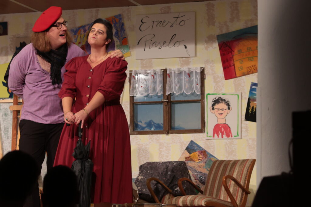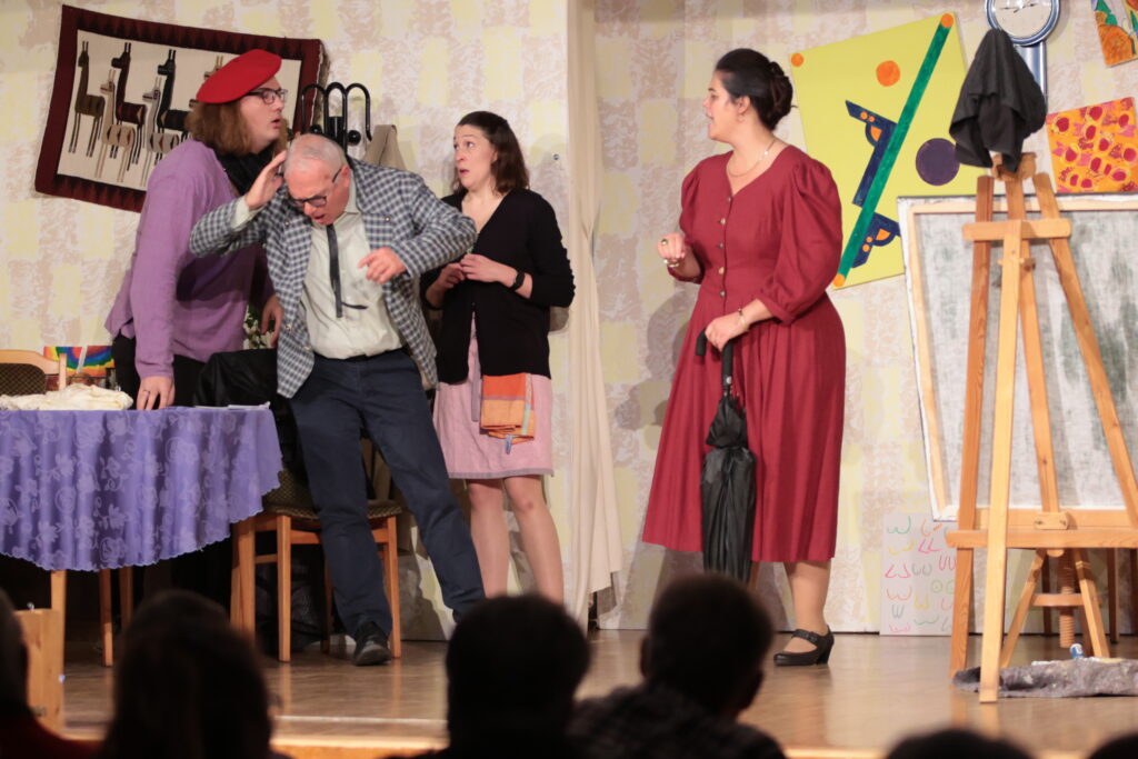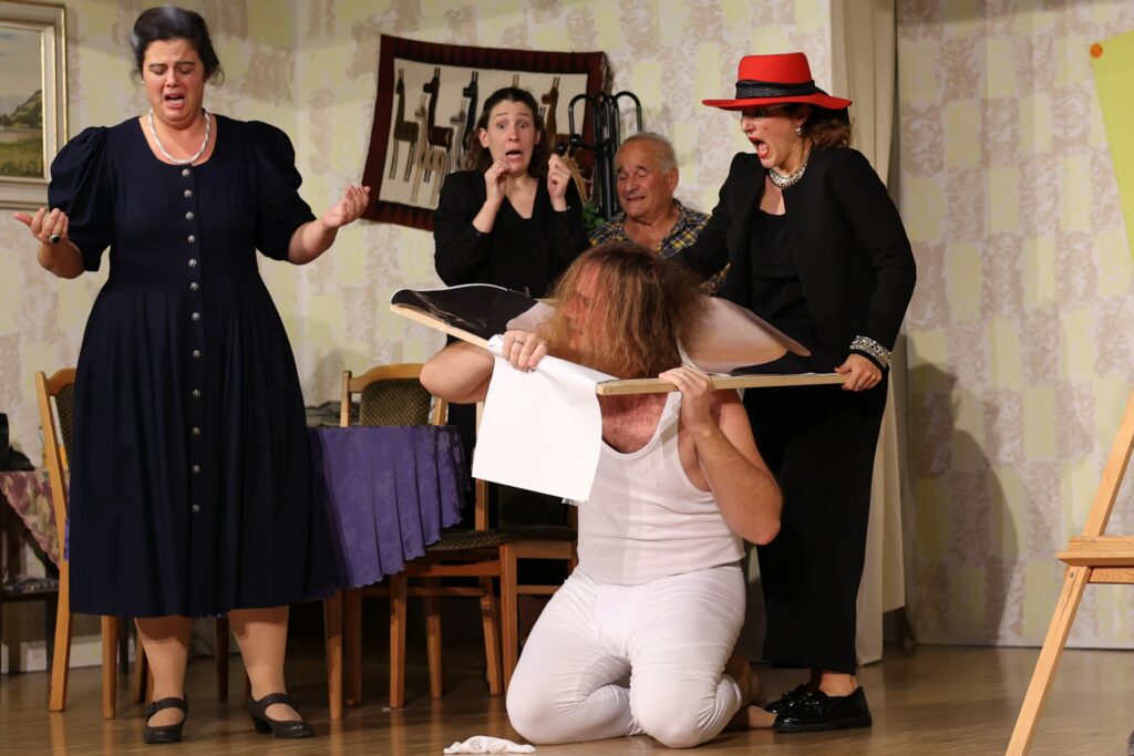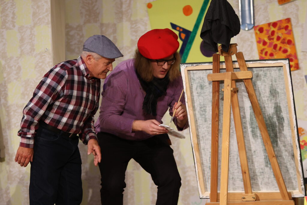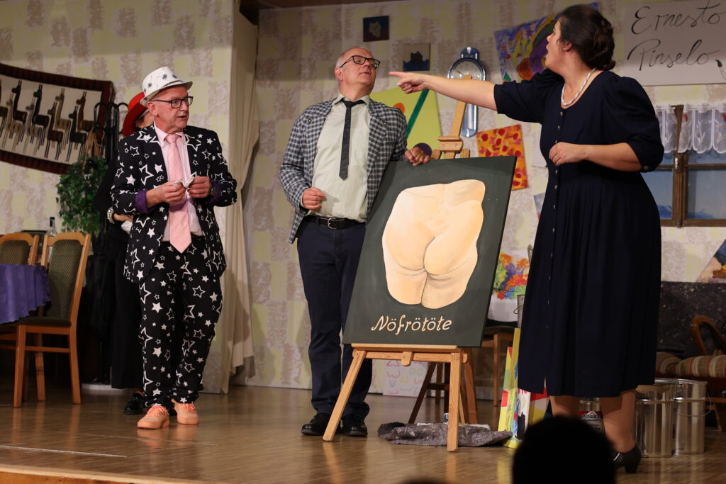 Dann geht der Vorhang auf für eine kurzweilige Komödie (Regie: Steffi Gärtner) um einen armen Kunstmaler (in der Hauptrolle: Michael Günter) und seine prekäre Finanzlage. Wenn bei ihm mal Besucher klingeln, dann ist es allenfalls der Gerichtsvollzieher (Jürgen Frehner) oder die neugierige Nachbarin (Claudia Willburger) oder ein kunstinteressiertes Paar, das aber nicht viel bezahlen will. Meister Pinselo hat dafür kein Verständnis, denn der Monet hat ja auch mit seiner Kunst Moneten gemacht. Die Schwiegermutter (Ramona Wallenfels) sieht ihn als Graffiti-Heini, der wohl nackte Frauen für den Playboy malt. Das sei doch Sodom und Gomorrha. Er solle doch wieder als ehrbarer Malermeister um Aufträge gucken, denn auf dem Tisch stapeln sich die unbezahlten Rechnungen. Doch der nackte Hintern der Nofrätäte – ja, so nennt er das Objekt seiner „Kunst“ – soll das Geld bringen. Natürlich ist sein Ruf lädiert; es heißt, Meister Pinselo hätte nicht mehr alle Farben im Kasten.