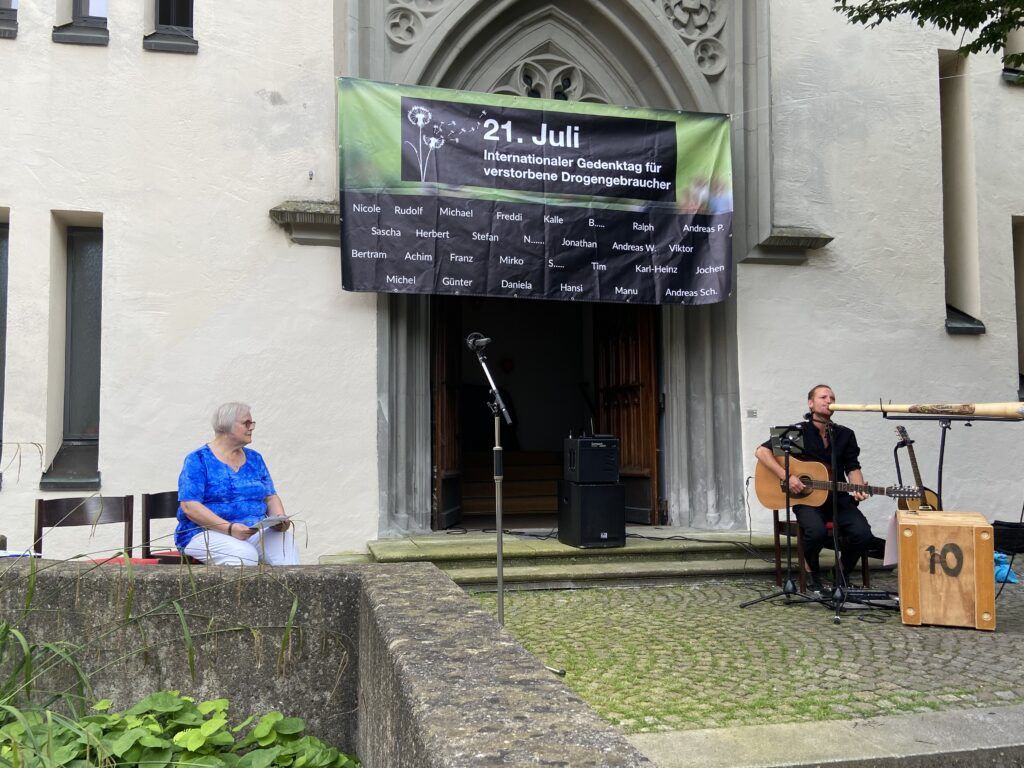 Sonntagabend, 21. Juli, an der Evangelischen Kirche Leutkirch, kurz nach 19.00 Uhr. Etwa 50 Leute haben sich hier versammelt. Selten mit heiterer Miene, eher traurig dreinblickend. Anlass: der “Internationale Gedenktag für Verstorbene durch Drogengebrauches”. Gedichte werden verlesen. In einem dieser Verse heißt es: “Lasst uns was tun – lasst sie überleben.”