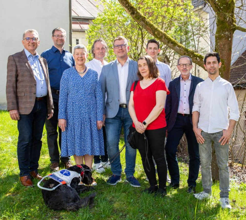 Für den Kreistag Ravensburg kandidieren auf der Liste der FWV im Wahlkreis Leutkirch: Walter Braun, Stefan Buck, Gisela Künst, Achim Neumann, Sven Stöckle, Selda Arslantekin mit Assistenzhund Zumie, Philipp Künst, Thomas Blum und Maisam Vatanpoor (von links nach rechts). Foto: FWV