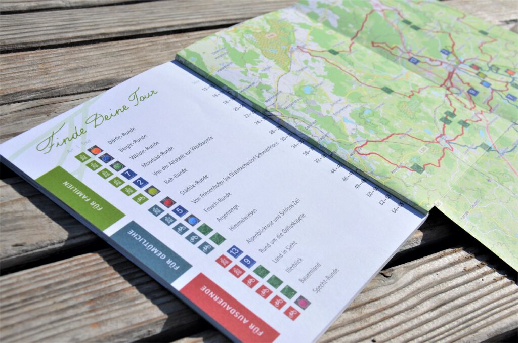 Neben detaillierten Tourenbeschreibungen enthält die Broschüre auch Informationen zu Highlights entlang der Routen, wie zum Beispiel die Allgäuer Genussmanufaktur und das Glasmacherdorf Schmidsfelden. Eine praktische Ausklappkarte dient zur Übersicht über die Touren.