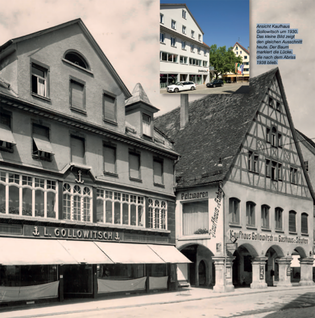 Ansicht der zwei Gebäude Gollowitsch um 1930 (das Kaufhaus links trug den Namen „Anker”, das Gebäude rechts hieß „Schatten”). Das oben eingeklinkte kleine Bild zeigt dieselbe Perspektive heute. Der Baum markiert die Lücke, die nach dem Abriss des „Schatten” im Jahre 1938 entstand (heute Marktplatz / Kornhausplatz). Die Collage wurde einer Broschüre des Initiativkreises „Orte des Erinnerns“ entnommen, die 2011 unter Federführung von Hubert Moosmayer herauskam.