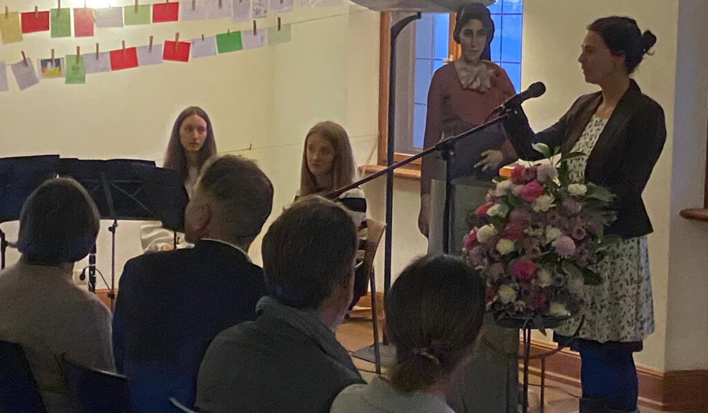 Maria Hönig spricht. Im Hintergrund sieht man einige Zettel an einer Wäscheleine; darauf haben Schüler Gedanken zu Lilo Gollowitsch niedergeschrieben. Insgesamt waren es weit über 100 Zettel.