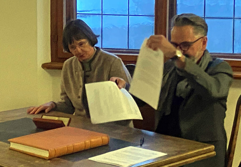 Hubert Moosmayer („Gegen das Vergessen”) und Susanne Jork (Bürgerstiftung Kreis Ravensburg) unterschreiben die Urkunde zur Gründung der Lilo-Gollowitsch-Stiftung.
