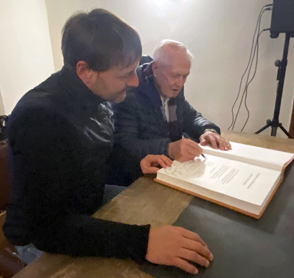 Stefan Böbel von der Stadtbücherei – jetzt Lilo-Gollowitsch-Bibliothek – und Oberbürgermeister Hans-Jörg Henle bei ihrer Eintragung ins Goldene Buch der Stadt Leutkirch. Dort ist die Umbenennung der Stadtbücherei am 100. Geburtstag des in Auschwitz ermordeten Leutkircher Mädchens dokumentiert.