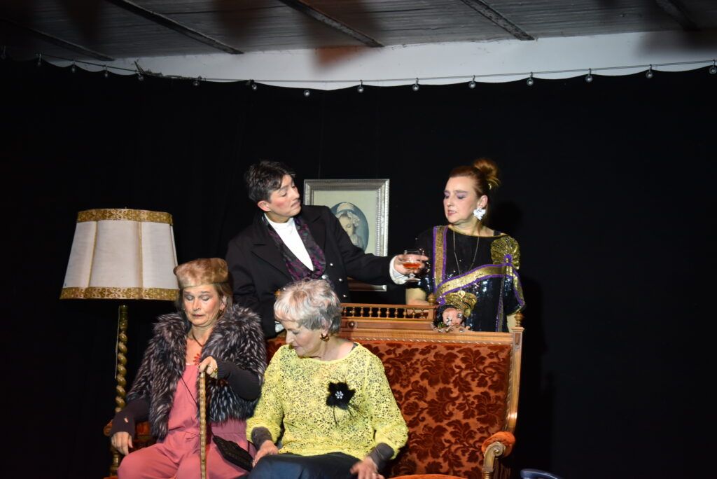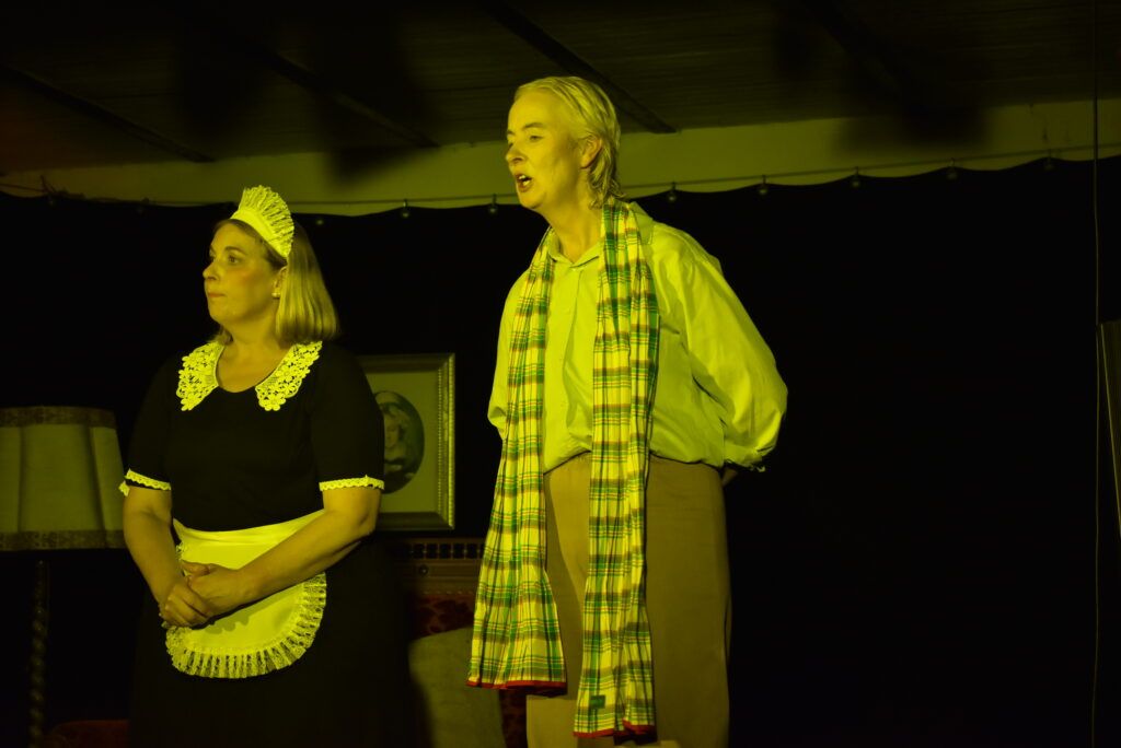 In perfekter Manier und mit adeligem Know-How ausgestattet, zeigte sich Butler Johann alias Simone Uetz. Rollenbedingt verlor der Butler immer mehr an seinem noblen Format, musste die eingeschenkten Cognacs selber austrinken, doch trotzdem kombinierte auch er das Geschehene am Hofe goldrichtig. Isabella Stumpp, im wirklichen Leben bekannt als Clowin Belina Belissimo, brillierte als Hugo Geist in der Tarnung als Kommissar-Assistent. Überhaupt gab es einige Geister und manch Geisterhaftes während den beiden Akten der Aufführung „Mörder mögen’s messerscharf“, ein Stück von Christine Steinwasser.