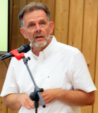 Was Nils Dörschlag von der Firma RES nicht zu sagen vermochte, kam von Peter Neisecke (Bild), dem Leiter des Bau- und Umweltamtes im Landratsamt Ravensburg: Am 26. Juni um 14.45 Uhr sei im Landratsamt von der Firma RES der Antrag zur Genehmigung von zwei WKA im Diepoldshofer Wald eingegangen. Neisecke erläuterte die rechtlichen Rahmenbedingungen einer WKA-Genehmigung, wobei er auch auf Lärmgrenzwerte nach dem Bundesimmissionsschutzgesetz (BImschG) einging und offen bekannte, dass ihm der Nacht-Grenzwert von 45 dB(A) zu hoch sei (tagsüber gilt sogar 60 dB(A)). Diese Festlegung stamme aus der Zeit des Erlasses des Bundesimmissionsschutzgesetzes, als es noch keine WKA gegeben habe. Allerdings wurde bei der Nennung der Grenzwerte nicht deutlich, ob diese im Bereich Diepoldshofen erreicht oder gar überschritten würden.