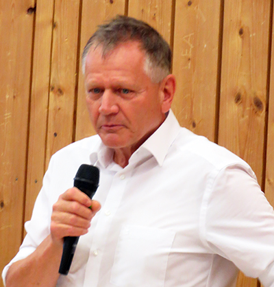 Anschließend hatte der Ortsvorsteher das Wort. „Ein misslungener Vortrag“, sagte Josef Mahler zum Video-Auftritt des Vorredners. Und: „Ob das die richtige Firma war …“ Hintergrund dieser Äußerung ist offenbar der Umstand, dass eine Gruppe von vier Männern (Josef Mahler, Berthold König, Wolfgang Diesch und Uwe Mayer) im Auftrag der Waldbesitzer Sondierungsgespräche mit verschiedenen Projektierern geführt und sich letztlich für RES ausgesprochen hat. Ortsvorsteher Josef Mahler (Bild) gab einen Rückblick auf aktuelle und frühere Windkraftplanungen. Vor zehn Jahren schon seien Waldbesitzer im Kontakt mit der Windkraft-Firma Uhl gestanden. Im Diepoldshofer Wald gebe es annähernd 60 verschiedene Besitzer; die Diözese habe den größten Anteil. Eine wichtige Rolle spiele die Waldwegegemeinschaft, bei der er als Ortsvorsteher die Funktion des Kassiers innehabe. Er selbst sei kein Waldbesitzer. Mahler nannte neben einigen nichtöffentliche Besprechungen und Versammlungen auch den 31. März 2024, als der Teilregionalplan Energie im Ortschaftsrat in öffentlicher Sitzung vorgestellt worden sei. Mehrfach appellierte er: „Seid fair. Respektiert jene Eigentümer, die sich für Windkraft aussprechen.“