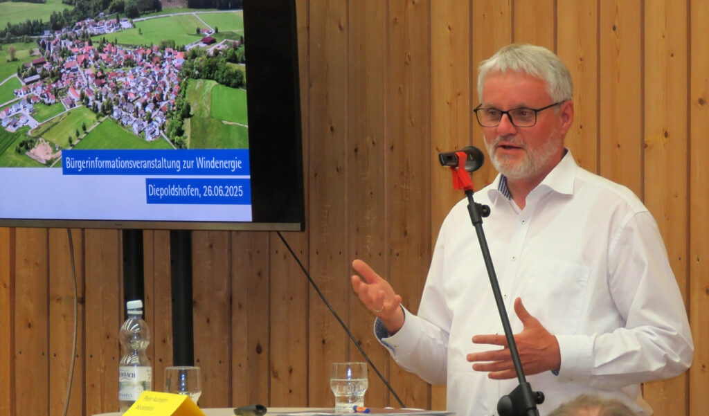 Windkraftanlagen der heutigen Generation haben eine andere Dimension als die 2012 geforderten. Vor diesem Hintergrund informierte der Oberbürgermeister, dass in Diepoldshofen – Stand 26. Juni 2025 – zwei Windkraftanlagen (WKA) geplant seien. Henle erwähnte auch die WKA-Planungen im Bereich Rotis und skizzierte die wegen der Einflugschneise für den Flugplatz in Unterzeil gestoppten Planungen im Leutkircher Stadtwald. Er betonte auch, dass die Einwohnerinformation durch die Stadt freiwillig sei. Die Konzeption in Diepoldshofen erfolge von privater Seite; städtische Grundstücke würden derzeit nicht eingebracht. Mit Blick auf den für 19.30 Uhr per Video-Schalte avisierten Vertreter des Windkraftprojektierers sagte Henle, er hätte es „gut gefunden, wenn der Projektierer persönlich anwesend gewesen wäre“.