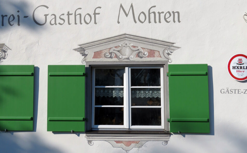 Auch Gottfried Härle und die Seinen haben es sich beim Neuanstrich der Läden am „Mohren“ nicht leicht gemacht; sie haben unseres Erachtens ein attraktives dezentes Grün gefunden. Seit 1897 befindet sich der „Mohren“ im Familienbesitz. Das ortsbildprägende Gebäude ist sichtlich gut in Schuss. Wir wollen es kurz betrachten.