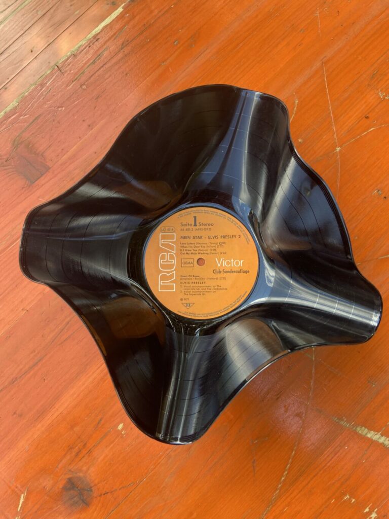 Aus alt mach neu? Umgenutzte Vinyl-Schallplatten auf Biertischen. Tischschmuck?