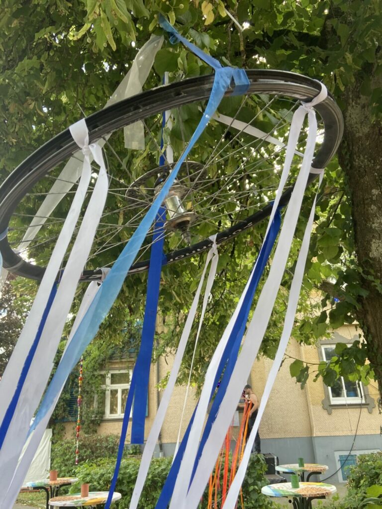 Umnutzung: Fahrrad-Räder als Reifen für Schmuck im Hof des Jugendhauses.