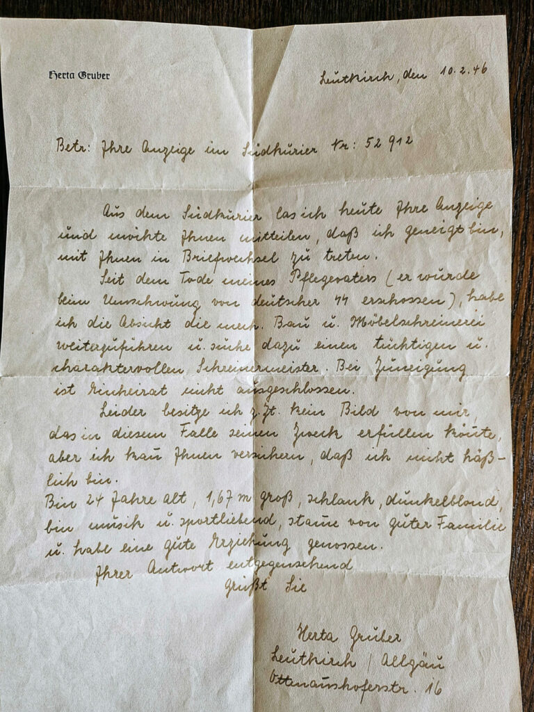 Als Herta Gruber, die Ziehtochter des am 27. April 1945 ermordeten Schreinermeisters Josef Luz, das Inserat las, setzte sie noch am selben Tag einen Brief auf. Vom 10. Februar 1946 datiert jener Brief, den Herta an den ihr noch unbekannten Engelbert Reichert schrieb. Er lautet im Wortlaut: