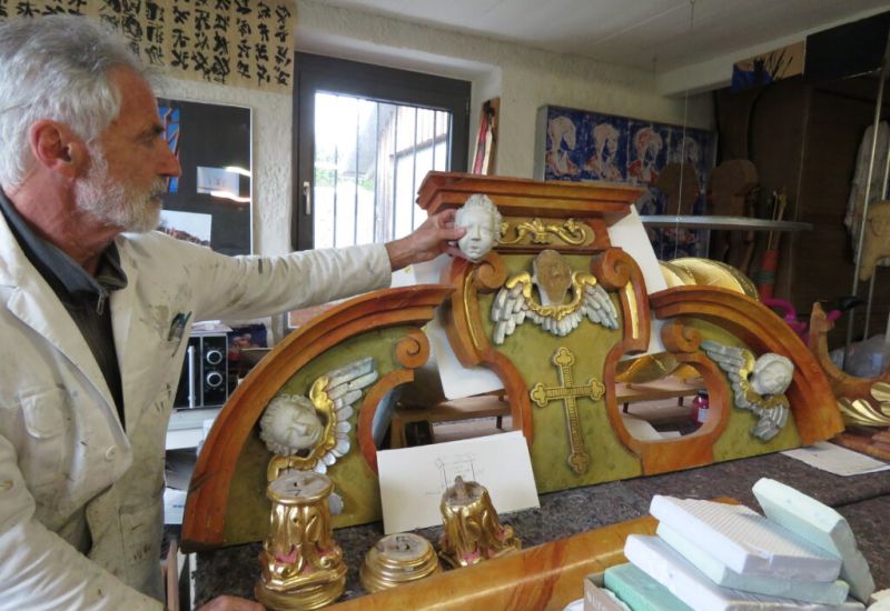 Erwin Roth vor seinem Haus in Ausnang. Rechts eine von ihm gefertigte hölzerne Skulptur. Foto (2024): Gerhard Reischmann