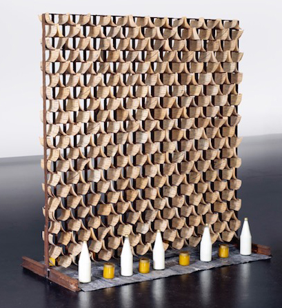 Die Installation „Vaterland” von Erwin Roth, bestehend aus Stahl, Blei, bedruckten und beschrifteten Karten, Milchflaschen und Honiggläsern, wirkt auf den ersten Blick wie eine akkurate, ornamentale Sichtblende. Dem aufragenden, annähernd quadratischen aus Flacheisen geschweißtem Raster der Installation sind, vergleichbar einem Altar, Milchflaschen und Honiggläser in regelmäßigen Abständen auf beiden Seiten vorgestellt und mit Bleiplatten unterlegt.