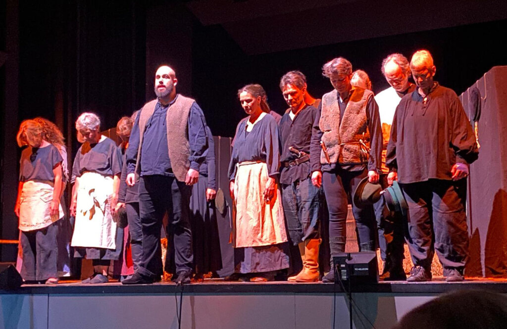 Leutkirch – Samstagabend, 31. Mai kurz nach 20.00 Uhr. Schauspielerinnen und Schauspieler des 21-köpfigen „Die Bauernoper”-Theaters gehen entlang des Festhallen-Wandlaufs in Leutkirch Richtung Bühne. Direkt vorbei am Publikum. Volles Haus – es werden noch Stühle reingebracht. Freundlich starker Applaus zu Beginn – fast Feststimmung. In der Pause geht das Bier aus.