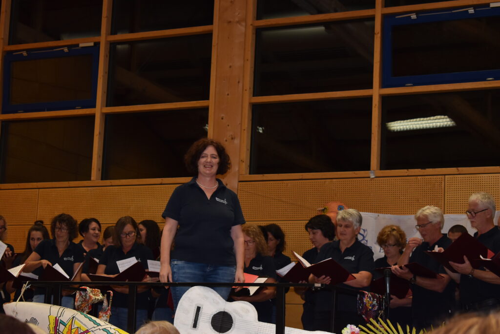 Für Getränke und Bewirtung sorgten Familien und Freunde der Sängergruppe, die mit gut 30 Sänger/innen dann die Bühne betrat. Begleitet von Ingrid Menig am Piano und anderen Instrumentalisten gab es ein buntes Programm an fröhlichen Stimmungsliedern, darunter „Lass die Sonne in Dein Herz“, sowie den bekannte Hit „Ein Stern, der Deinen Namen trägt“. Nach einem stimmungsvollen „Ehrenwort“ durfte man wieder eine Pause mit leckeren Seelen genießen.