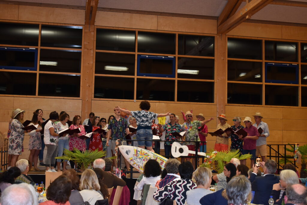 Tobias Stohr, Sohn der Chorleiterin aus Engerazhofen, dankte allen Besuchern, Sänger/innen, den vielen Helfern und DJ Franzi, der den letzten Part des Abends übernahm. Zuvor hatte die Sängergruppe noch eine Überraschung parat: Alle kamen in unterschiedlichen Urlaubs-Outfits, in Shorts und Hawaii-Hemden, mit Sonnenhut und -brille und luden mit „Lollipop“ gleich zum Mitsingen und Mitschnippen ein. „Surfin’ USA“ von den Beach Boys durfte nicht fehlen und „La Bamba“ mit einigen kräftigen ARIBA –Zwischenrufen, ebenso der berühmte „Izibizi-tiniwini-Strand-Bikini“, der wohl nie getragen wurde.