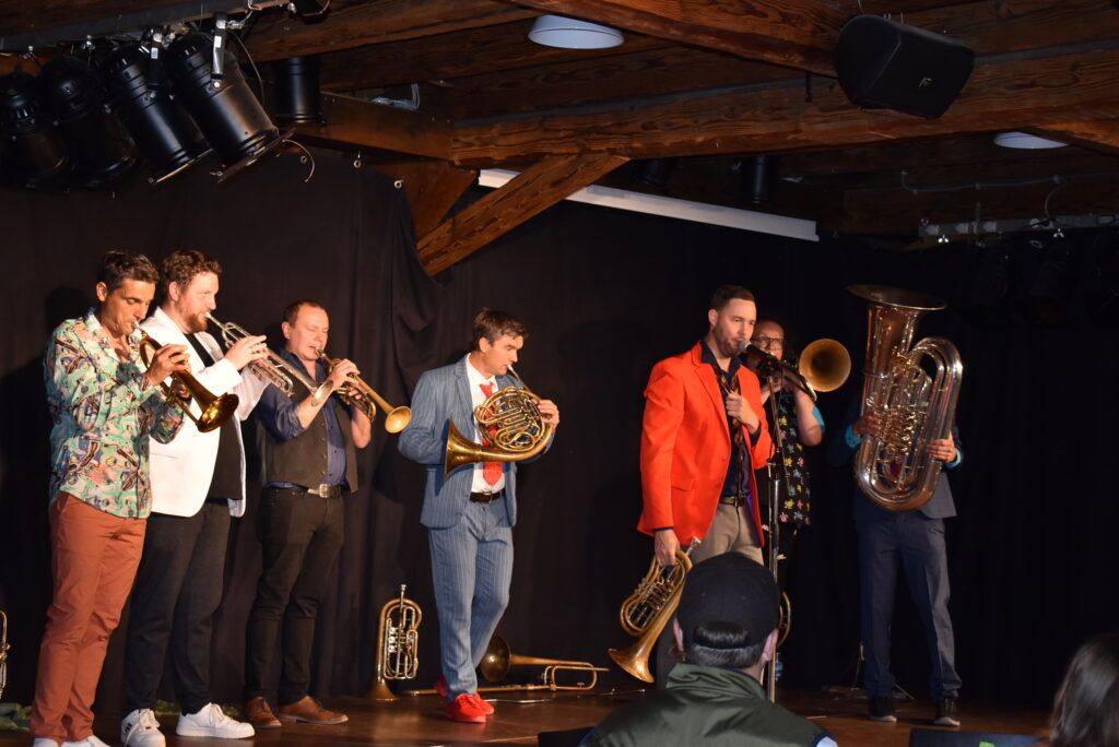 Flotte Polka-Klänge und Volksmusik, bekannte Westernhits, Oldie-Ohrwürmer wechseln sich mit Jazz, Bigband-Sound, Filmmusik und sogar Klassik ab, dazwischen gibt es fein garnierte Pantomine-Comedy. Nach den Shows „Als mir no Buaba waaret“ und „Wild Wild Weschd“ konnte man sich wieder mal zurücklehnen, sich über neu arrangierte Melodien, ausgefeilte Komik und besonders über Mimik und Gestik freuen, die alle Musiker selten gut beherrschen. Mindestens so perfekt, wie ihre Instrumente. Schließlich sind nicht weniger als drei vom Ensemble zudem Dirigenten, wie Thomas Wolf aus Unterzeil an der Posaune, der neben der MK Fischen / Allgäu auch die große und bekannte Brassband A 7 unterm Dirigentenstab hat, seit einigen Jahren, mit Konzerten in ganz Süddeutschland.