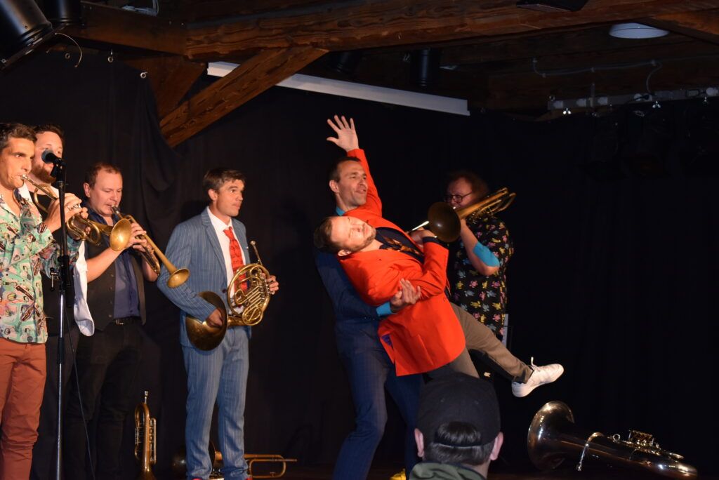 Apropos Anbaggern. Wenn der Flo mit dem Manne … sich hinter die Büsche schlägt (im Bocksaal in die Küche legt), dann … Besonders Thomas legt sich mit seiner Posaune ins Zeug und mimt, was da für die Konzertbesucher unsichtbar in der Küche „abgeht“.
