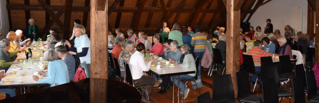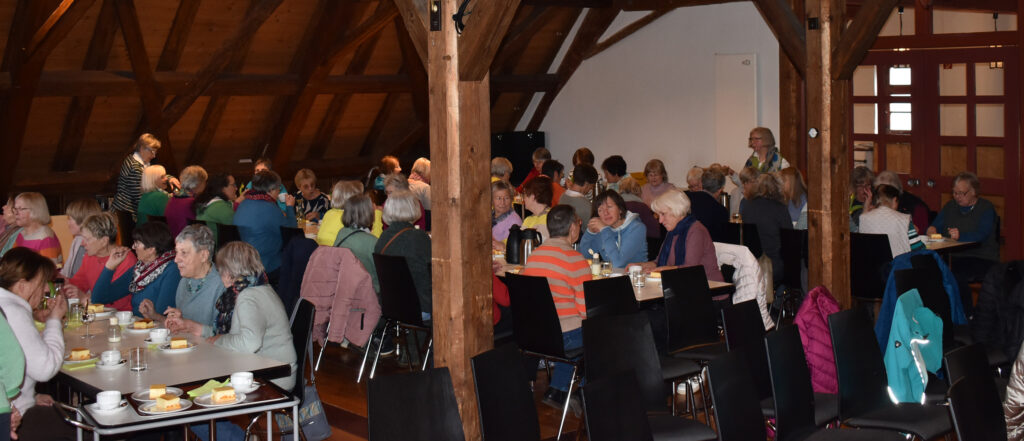 Dann gab es den Kaffee, Tee und tolle Kuchen, die vom Team des Frauenbunds Leutkirch serviert wurden. Gelbe Tulpen schmückten die Kaffeetische, ebenso die freudigen Ereignisse auf Papier, die vorher genannt worden waren. Es gab vieles zu bereden, denn viele Frauen kannten sich untereinander, es war eine schöne, angenehm-freudige Atmosphäre.
