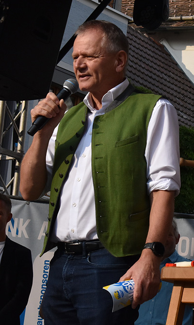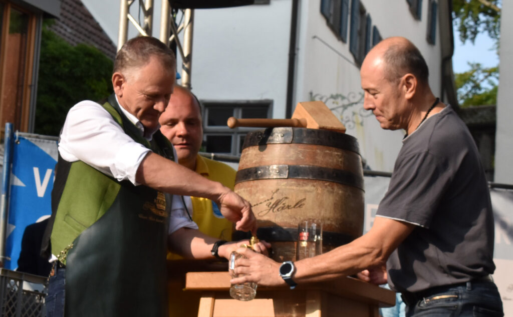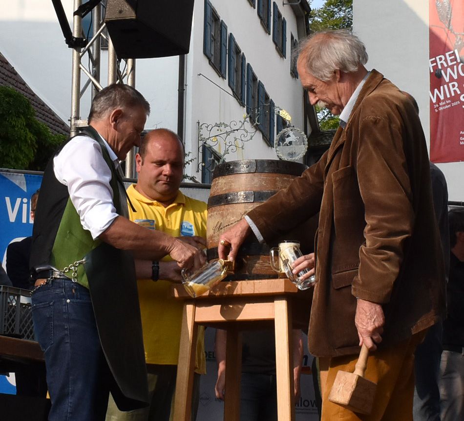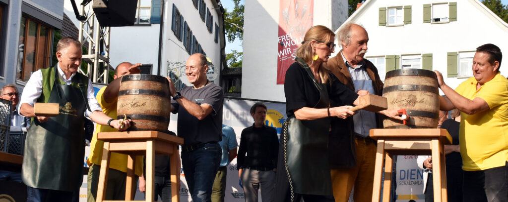 OB Henle (Bild) sprach ebenfalls herzliche Dankesworte, freute sich über den blauen Himmel, die vielen Gäste in Leutkirch und wünschte dem ALSO-Verein gutes Gelingen für die nächsten zwölf Tage Programm. Dann ging es an die Bierfässer. Henle hat Erfahrung und das Bier floss alsbald in die Krüge. Novizin Silvia Hess brauchte etwas Unterstützung, aber Gottfried Härle war zur Stelle, reparierte und half.