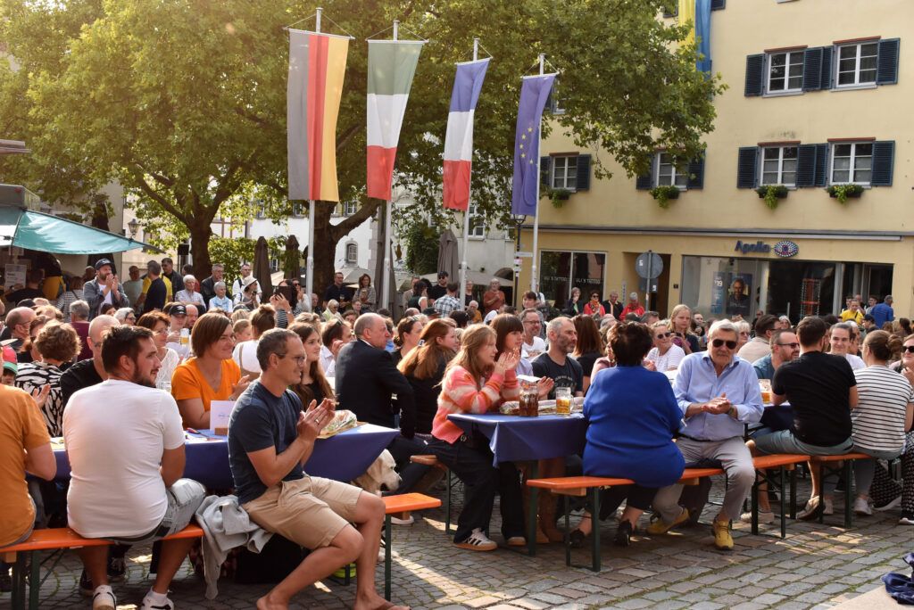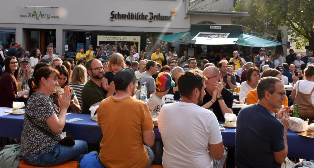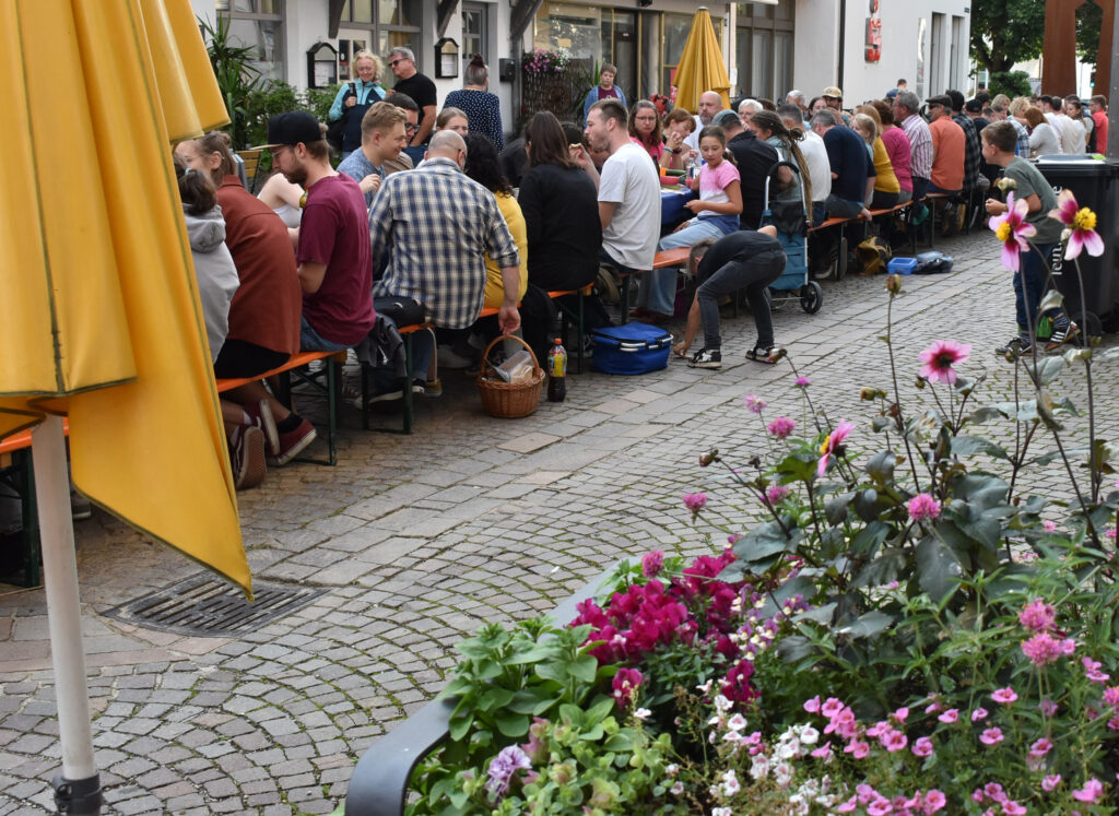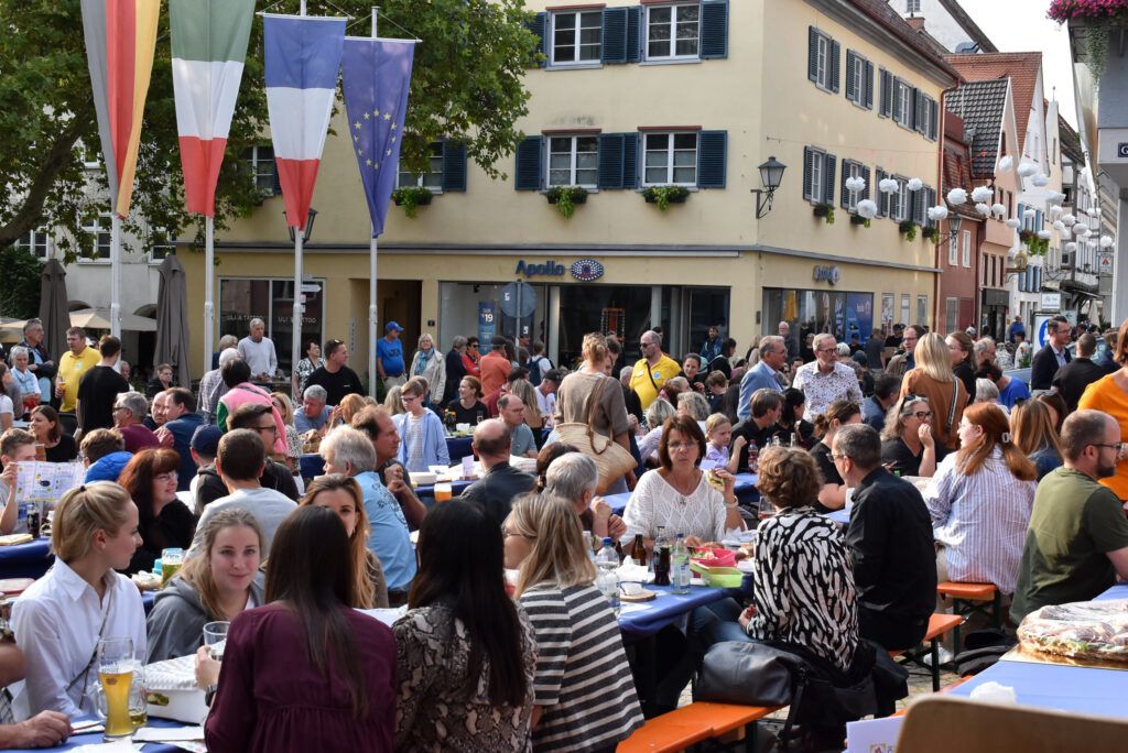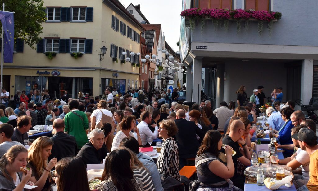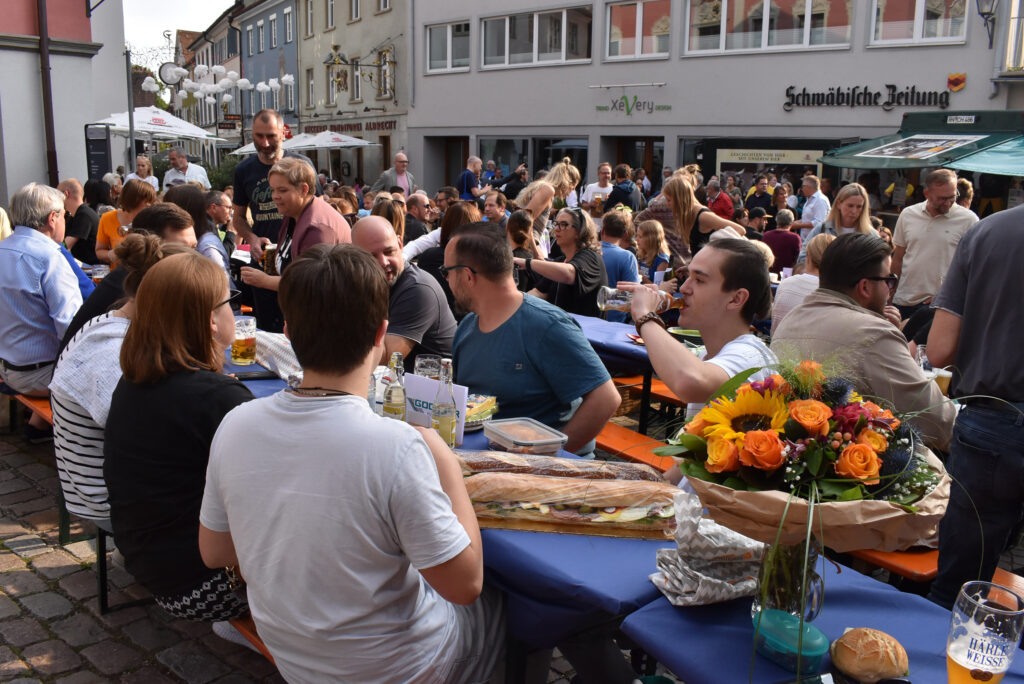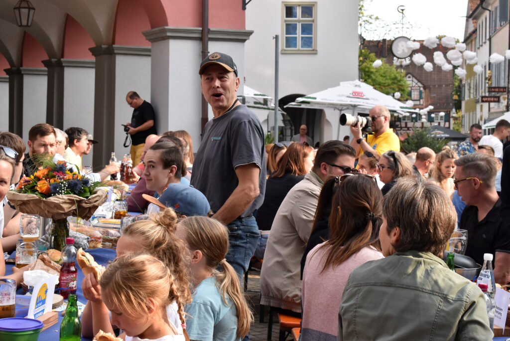 Jede/r konnte sein eigenes Vesper mitbringen. Da gab es leckere Brotaufstriche, verschiedene Salate, Wurst- und Käsevariationen, man sah Riesen-Laugenbrezeln, belegte Seelen und Gebäck von Bäckereien, pikant oder süß. Alle Gaststätten waren voll besetzt, an der Vespertafel alle Plätze belegt und alle Sitzmöglichkeiten in der Altstadt besetzt. Am Gänsbühl fand der Fassbier-/Freibier-Anstich statt.