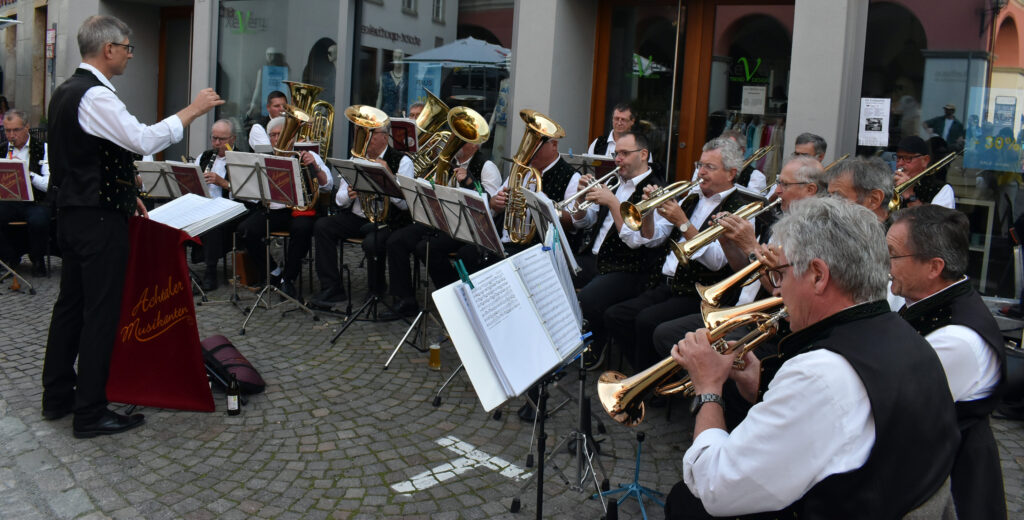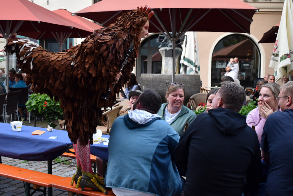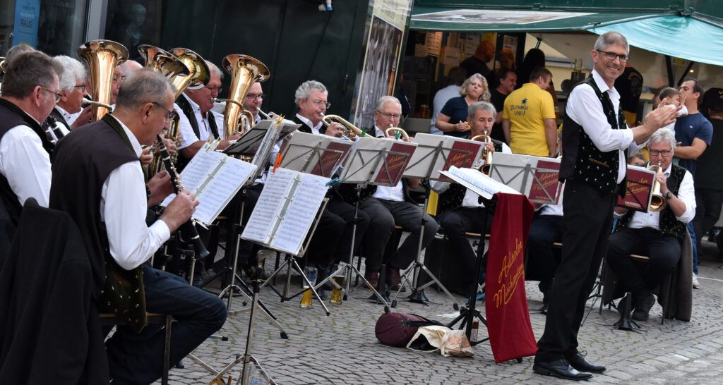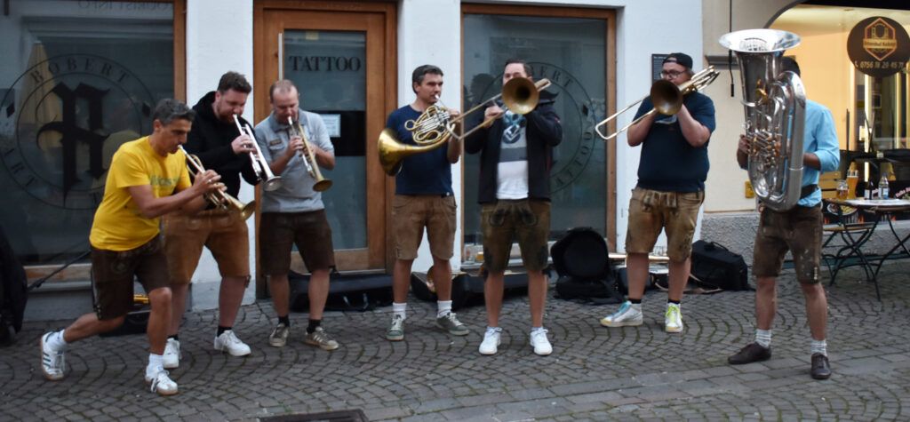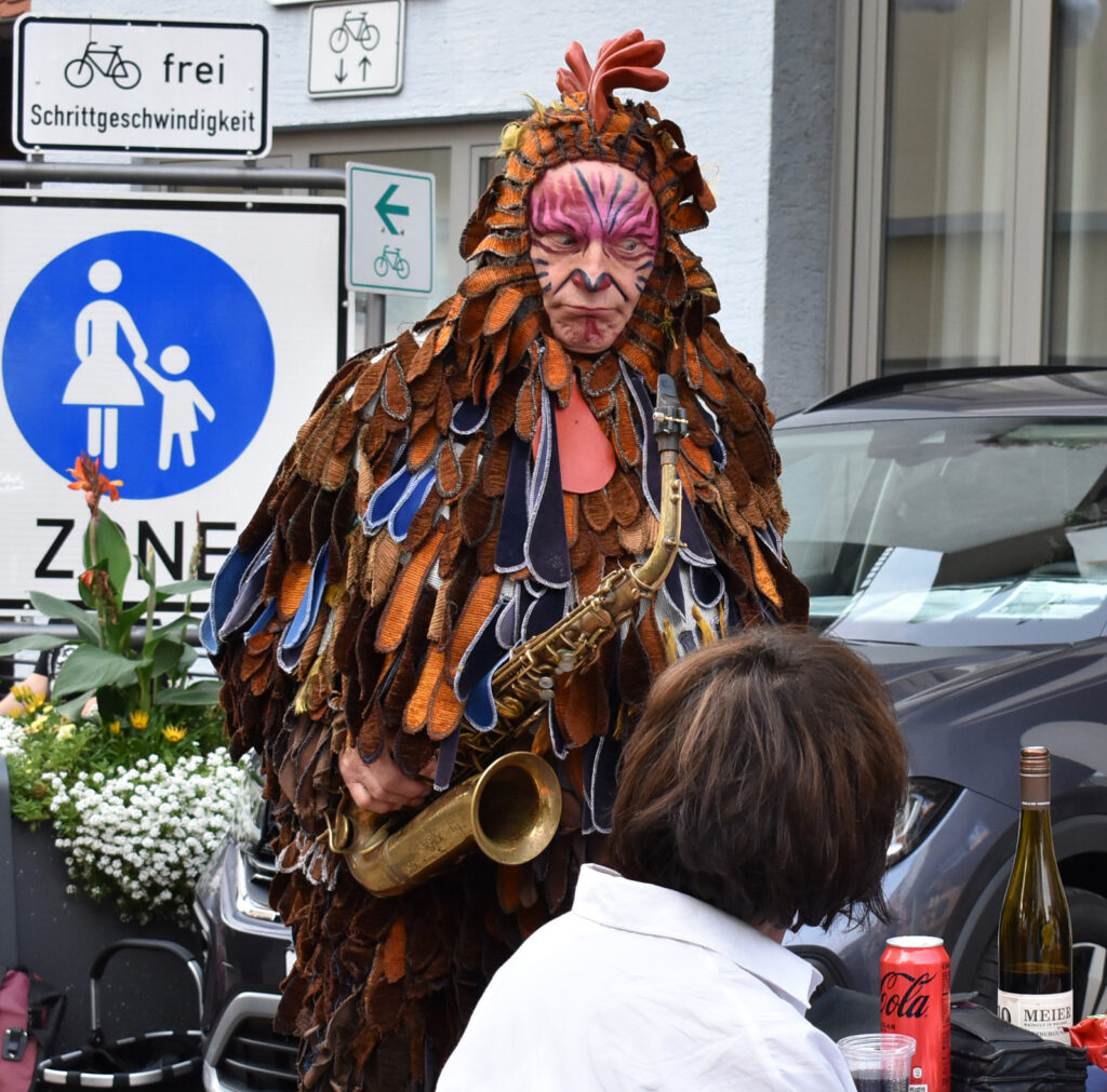 Die Sonne schien, es war war warm, es ist wieder Sommer, die Menschen sehnen sich nach Veranstaltungen wie dem ALSO, wie „Leutkirch vespert“, genießen das Ambiente der Altstadt, genießen die Gemeinschaft, die Gesellschaft und die tolle Musik, die in der ganzen Marktstraße zu erleben war. Die drei Ensembles, die Achtaler Musikanten mit fetziger Blasmusik, die leicht schrägen Blech-Musiker von „Verstehen Sie Brass“ und eine ganz junge Formation um Marius Schosser mit flotten Klängen sorgten für beste Unterhaltung. Drei sehr schräge „Hühner“ in tollen Kostümen unterhielten nicht nur mit Jazz und Blues, sondern auch mit ihrer „Gang-Art“ und ihrem Getue rund ums Publikum, das sich köstlich amüsierte.