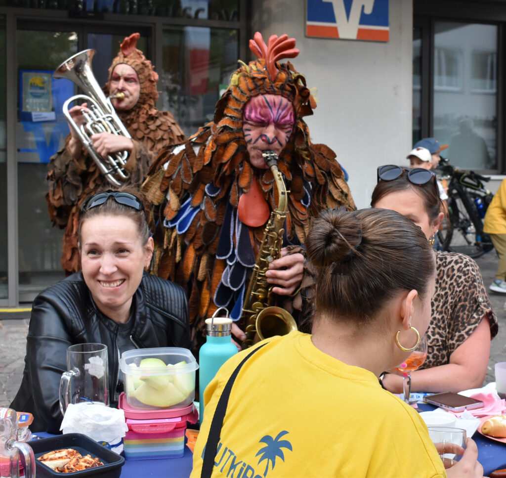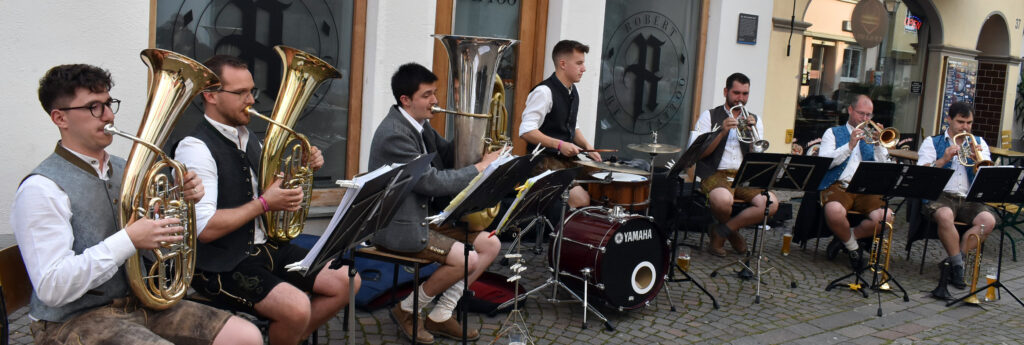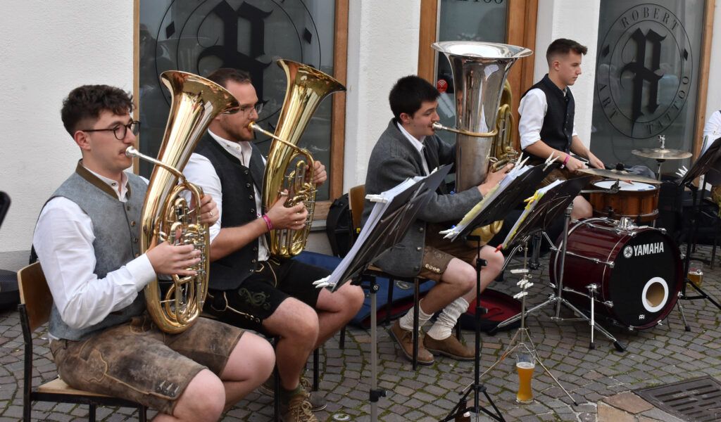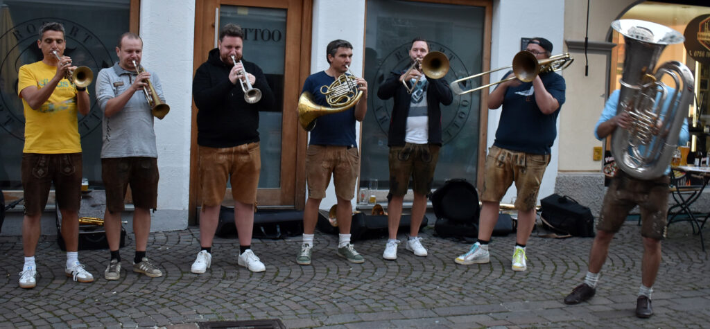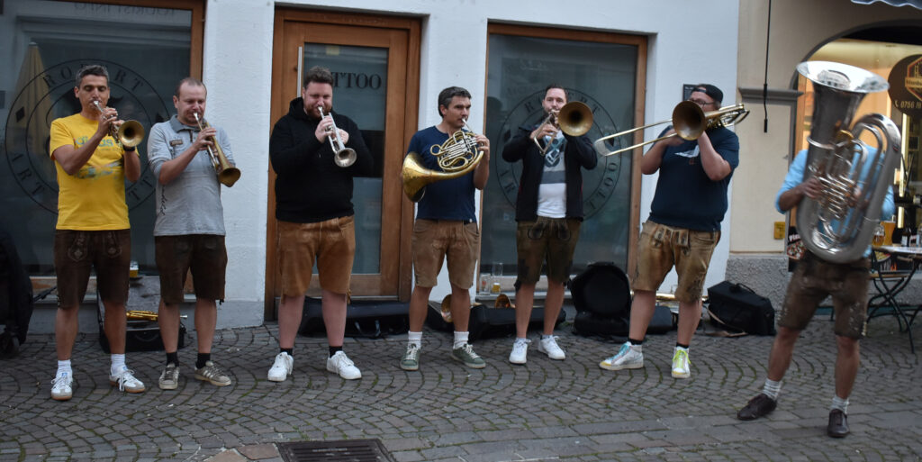 Die Sonne schien, es war war warm, es ist wieder Sommer, die Menschen sehnen sich nach Veranstaltungen wie dem ALSO, wie „Leutkirch vespert“, genießen das Ambiente der Altstadt, genießen die Gemeinschaft, die Gesellschaft und die tolle Musik, die in der ganzen Marktstraße zu erleben war. Die drei Ensembles, die Achtaler Musikanten mit fetziger Blasmusik, die leicht schrägen Blech-Musiker von „Verstehen Sie Brass“ und eine ganz junge Formation um Marius Schosser mit flotten Klängen sorgten für beste Unterhaltung. Drei sehr schräge „Hühner“ in tollen Kostümen unterhielten nicht nur mit Jazz und Blues, sondern auch mit ihrer „Gang-Art“ und ihrem Getue rund ums Publikum, das sich köstlich amüsierte.