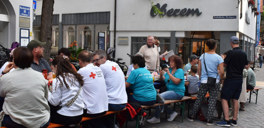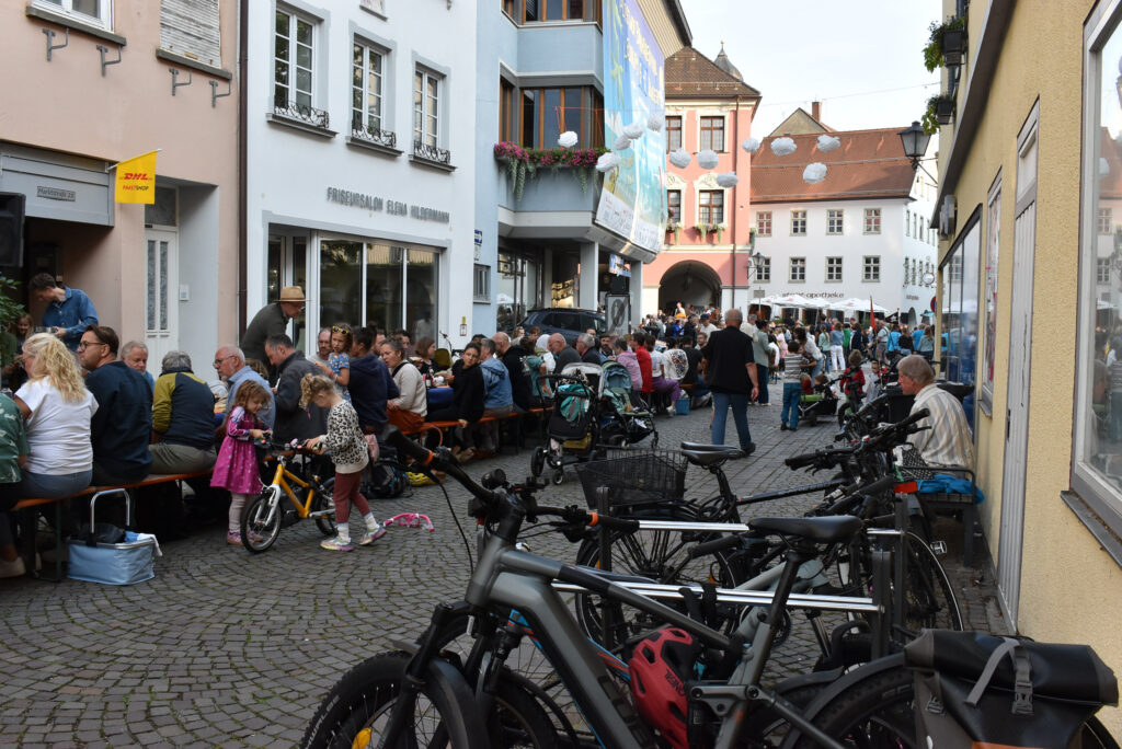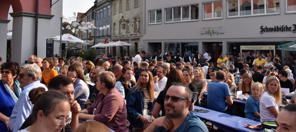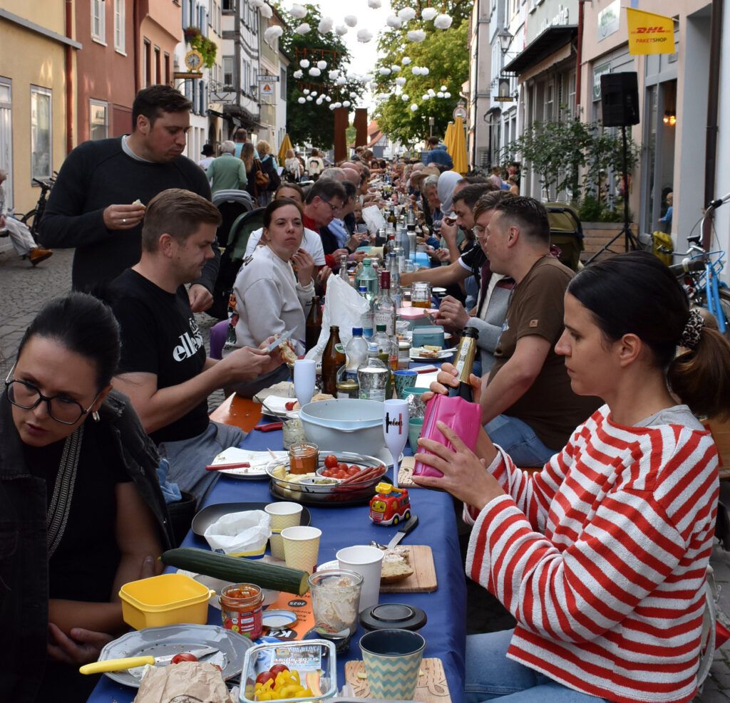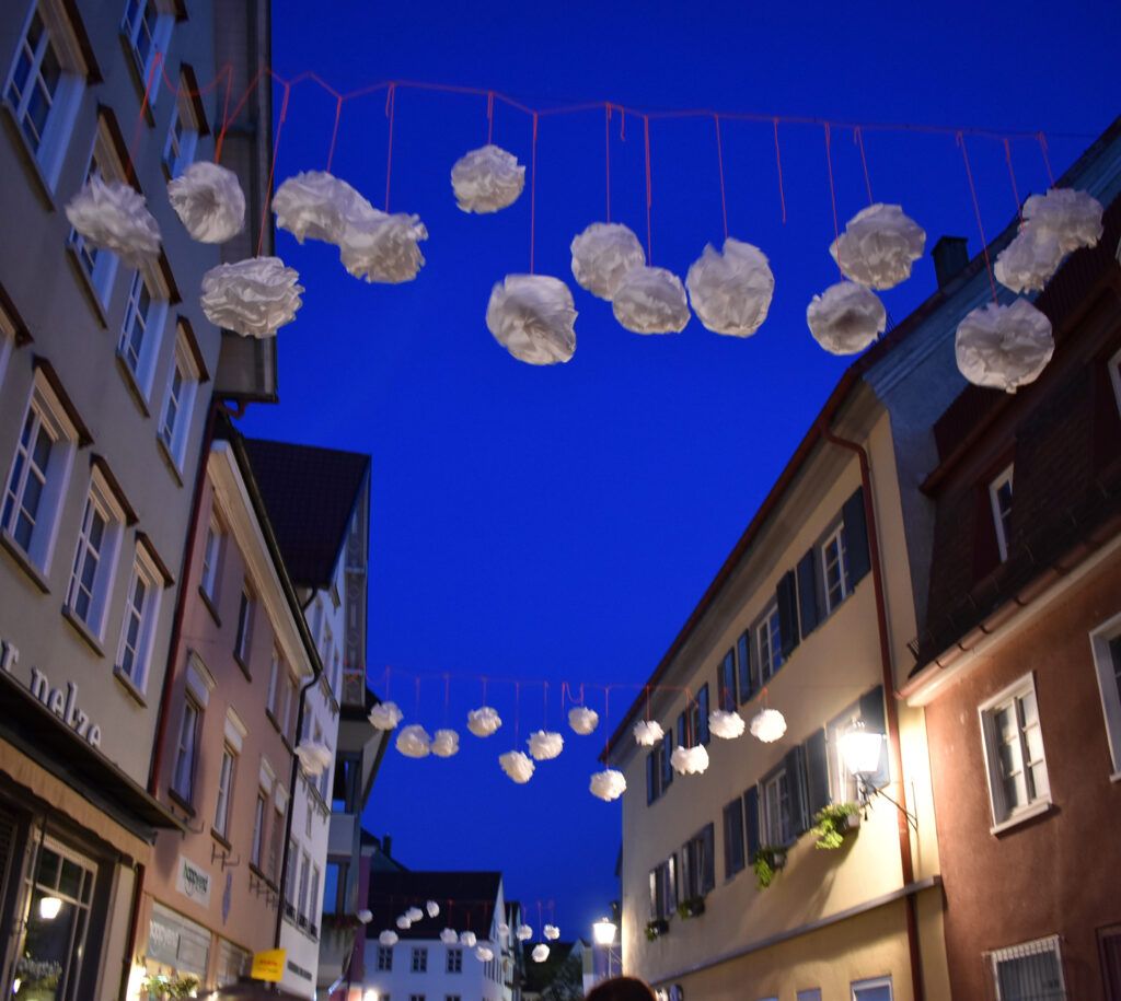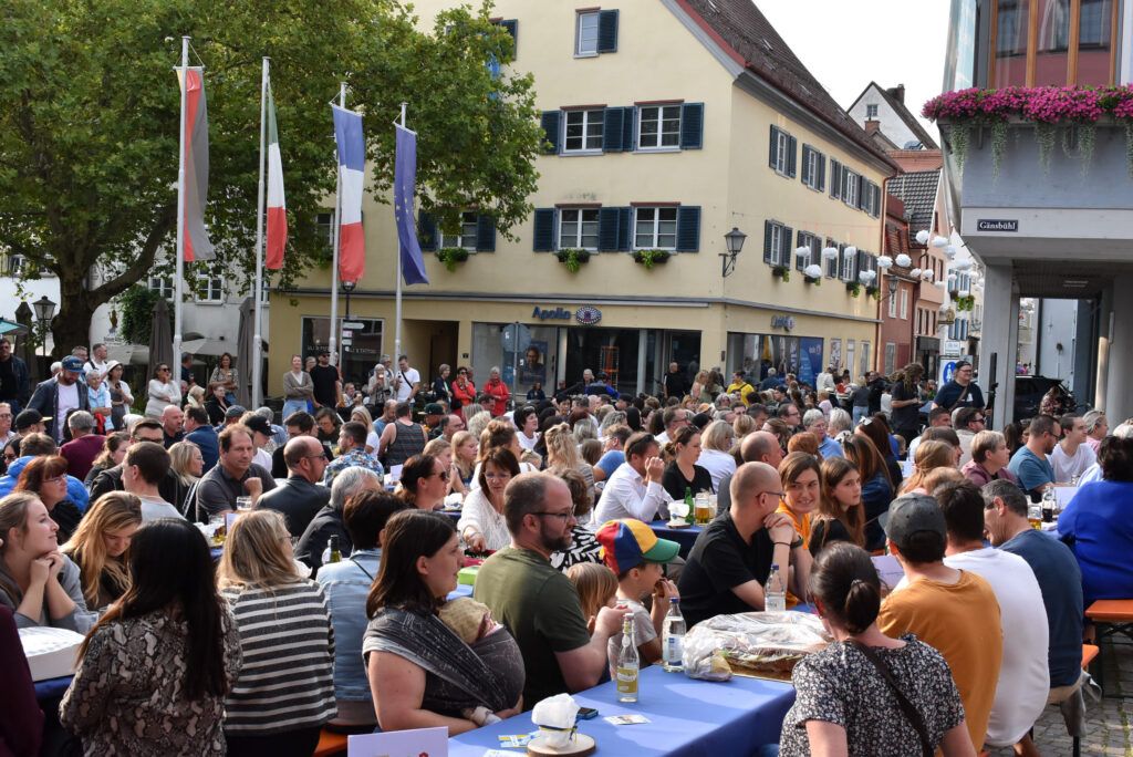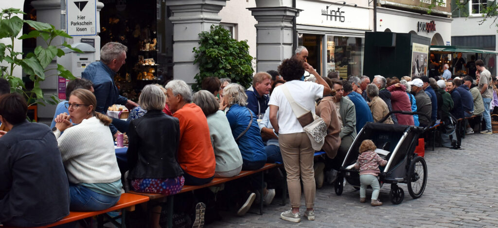 Leutkirch – Der Besuch war schier unglaublich: Zahlreiche Gäste sicherten sich am Mittwoch (6.8.) schon vor 18.00 Uhr einen Platz an der langen Vespertafel, die der ALSO-Verein mit Biertischen und –bänken aufgebaut hatte, samt schöner Dekoration. 120 Biertisch-Garnituren waren aufgestellt, alle voll besetzt. Auch auf Treppen und Stufen lagerten Besucher. Thomas Stupka von der Stadtverwaltung schätzt die Besucherzahl auf mehr als 1200. Die einzigen Wolken die man sah, waren aus Papier und baumelten an Schnüren über der Marktstraße. Ein herrlicher Sommerabend.