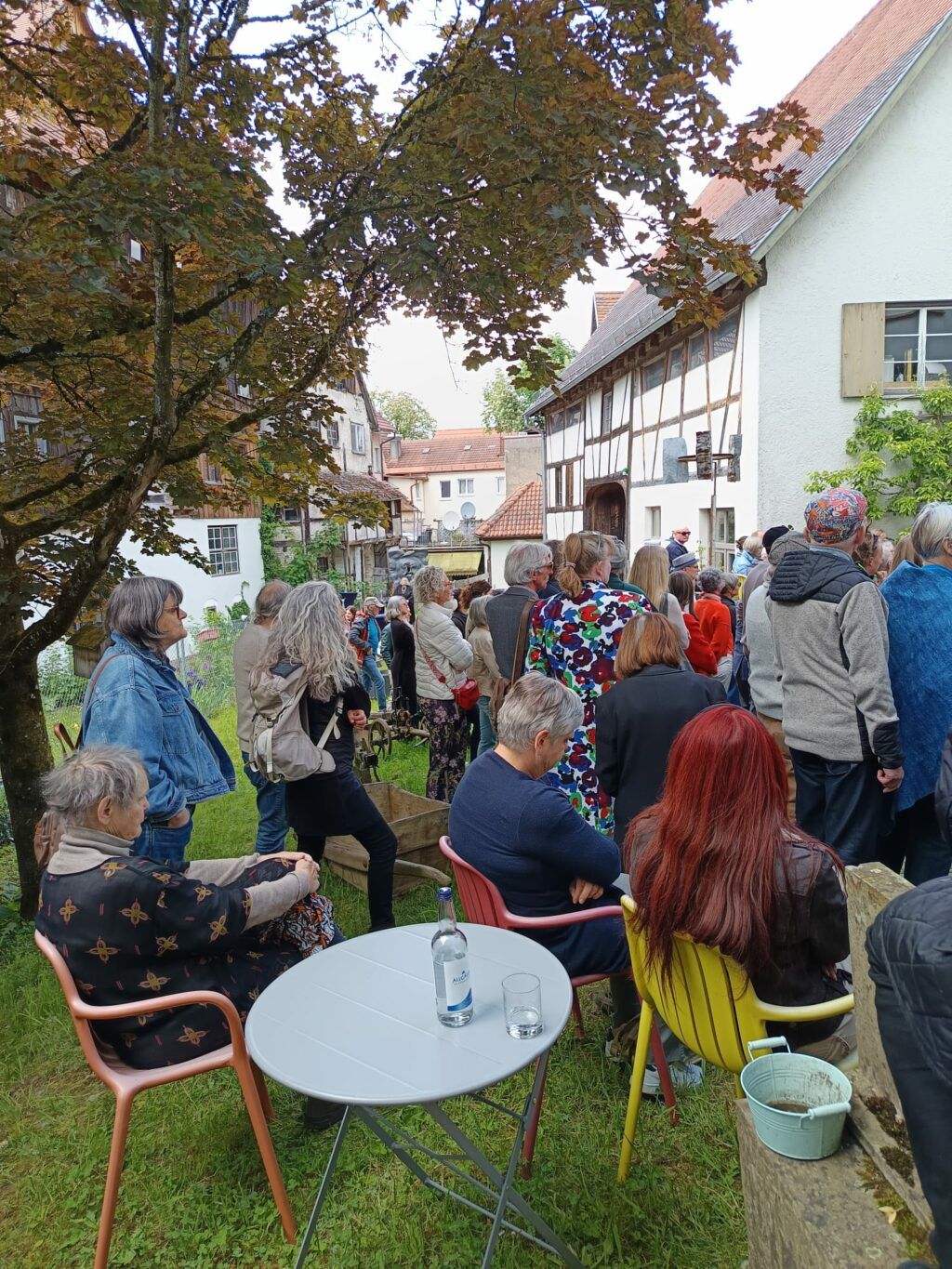 Bei der Eröffnung am letzten Samstag (24.5.) hatten sich im Hof zwischen Gotischem Haus und Museum im Bock viele gut gelaunte Besucher eingefunden. Dass es dann mit der Lautsprechertechnik leider ziemlich haperte, tat der erwartungsvollen Stimmung keinen Abbruch. Zunächst begrüßte Bürgermeister Dr. Daniel Gallasch und dankte allen Beteiligten: dem Galeriekreis, der Heimatpflege, dem Grafiker und schließlich dem Bläserensemble „MKD-brass-5“, das die Veranstaltung beschwingt musikalisch umrahmte. Der Bürgermeister hob vor allem das Alleinstellungsmerkmal des Leutkircher Projekts hervor, nämlich das Zusammenspiel von regionaler Geschichte und moderner Kunst.