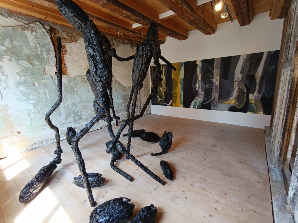 Der zweite Teil der Ausstellung, der exklusiv der Kunst gewidmet ist, wird im Gotischen Haus gezeigt – und damit in einem der spektakulärsten Ausstellungsorte zwischen Donau und Bodensee überhaupt. Auch in dieser Ausstellung gelingen hier wieder wunderschöne Räume. Einige Künstlerinnen und Künstler haben aus ihren Beständen Arbeiten ausgesucht, die ihnen zur vorgegebenen Thematik passend erschienen. Martina Geist (Ostfildern-Kemnat) steuert zum Beispiel einige ihrer neuesten bemalten Holzstöcke bei. Von Heiko Herrmann (München) – unvergessen seine Ausstellung vor zwei Jahren – ist ein für seine Verhältnisse leichthändiges, eher an eine Zeichnung erinnerndes Gemälde zu sehen. Jörg Bach (Mühlheim) zeigt eine sehr stimmige Gruppe schwarz eingefärbter Stahlskulpturen und Tuschemalereien. Obwohl seine Formensprache ungegenständlich ist, meint man doch hier Bilder der geschundenen menschlichen Kreatur zu sehen. Diese war definitiv das Thema des 2019 verstorbenen Malers Raimund Wäschle (Waldburg). Seine erdigen Leinwandbahnen fügen sich sehr schlüssig in die im Rohzustand belassenen Räume.