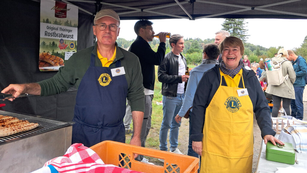 Der sehr gute Besuch aus der Bevölkerung sprach wieder für sich. Hunger und Durst musste zudem niemand leiden. Für Getränke, Wurst und Wecken wurde schon immer gesorgt. Aber dieses Jahr kam noch etwas Spezielles hinzu: Vom angenehmen Wetter begünstigt, war auch großes Gedränge an einem Grill vor der Halle. Denn eigens angereiste Mitglieder des Partner-Lions Clubs Meiningen hatten aus ihrer Thüringer Heimat 300 von den berühmten Rostbratwürsten mitgebracht. Keine einzige blieb übrig – und jedermann war voll des Lobes.