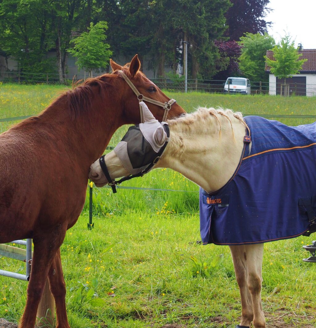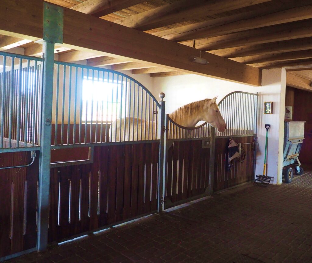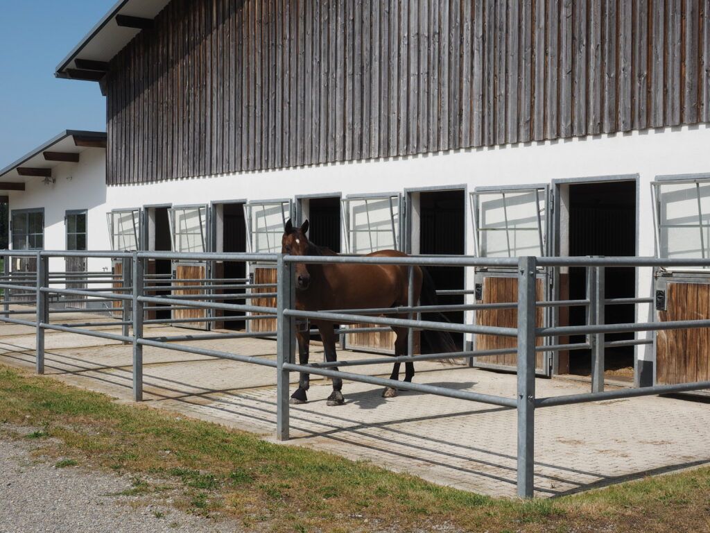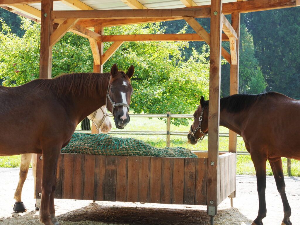 - Fütterung: individuelle Fütterung der Pferde morgens und abends in den Paddockboxen, Heu ad libitum auf den Paddocks.