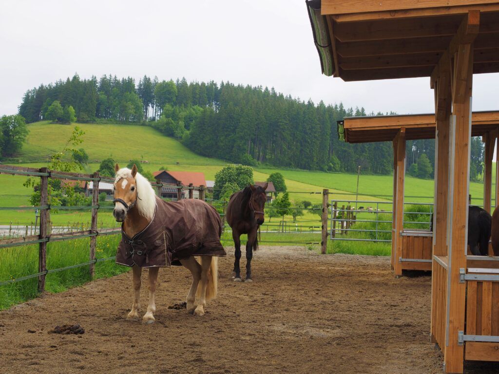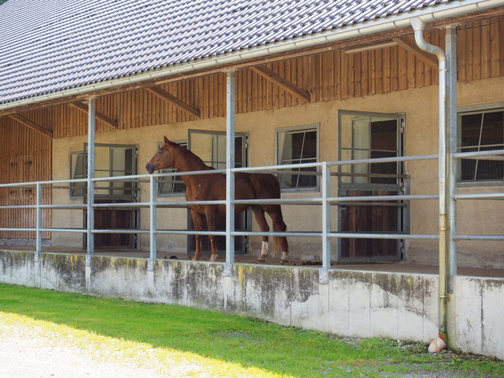 Paddockboxen, Gruppenausläufe, Wiesen: Alles ist darauf ausgerichtet, dem Pferd viel Bewegungsfreiheit, Struktur und Sozialkontakt zu bieten. Die Pferde leben in kleinen Herden mit fester Aufteilung: Wallache, Pensionsstuten und die eigene Zuchtstutengruppe. Ein weiteres Merkmal dieses Pferderesorts im Allgäu: Jedes Pferd hat täglich mindestens zehn Stunden freie Bewegung an der frischen Luft. Sommer wie Winter. Die Pferde stehen in Kleingruppen auf großzügigen, befestigten Paddockflächen mit Heuraufen, Tränken und Sozialkontakt. Die Integration neuer Pferde erfolgt mit großer Sorgfalt: über Sichtkontakt im Stall und getrennte Ausläufe. Erst wenn das Verhalten der Gruppe Stabilität zeigt, wird vollständig zusammengeführt. Ganz bewusst finden Neuaufnahmen ausschließlich während der Weidesaison statt, denn das reduziert Stress und Verletzungsrisiken.