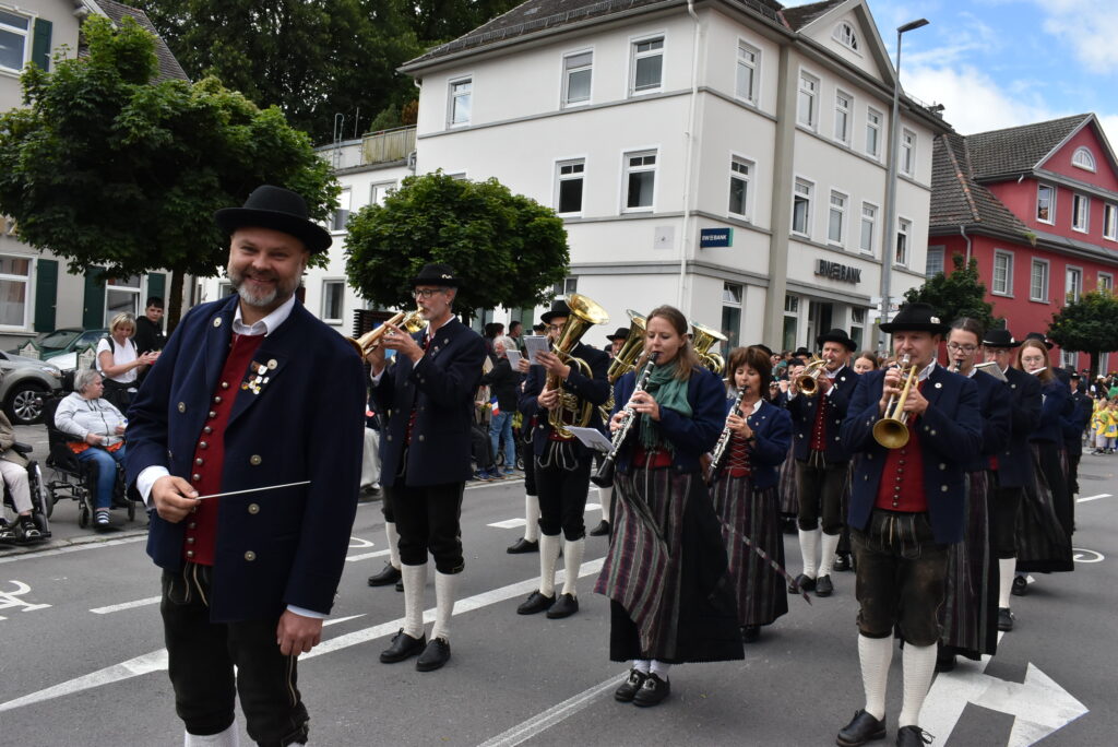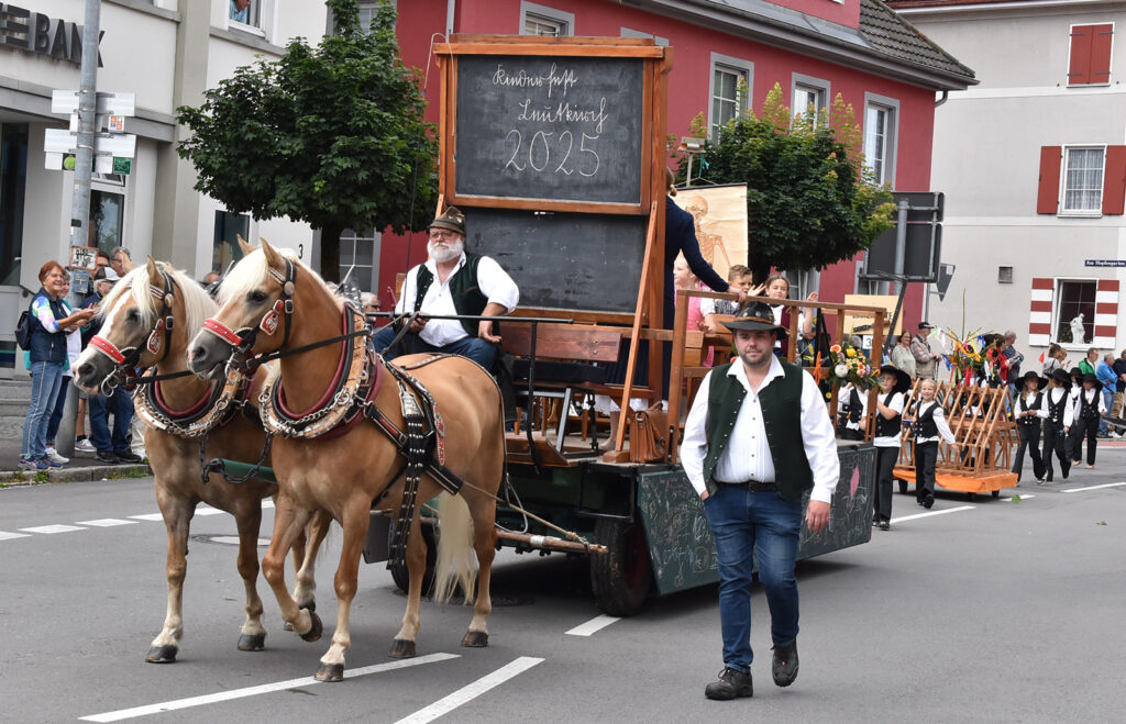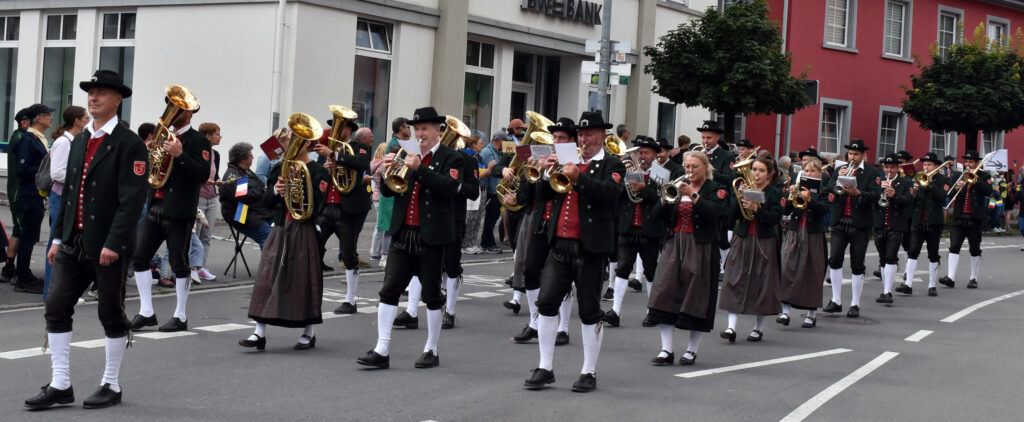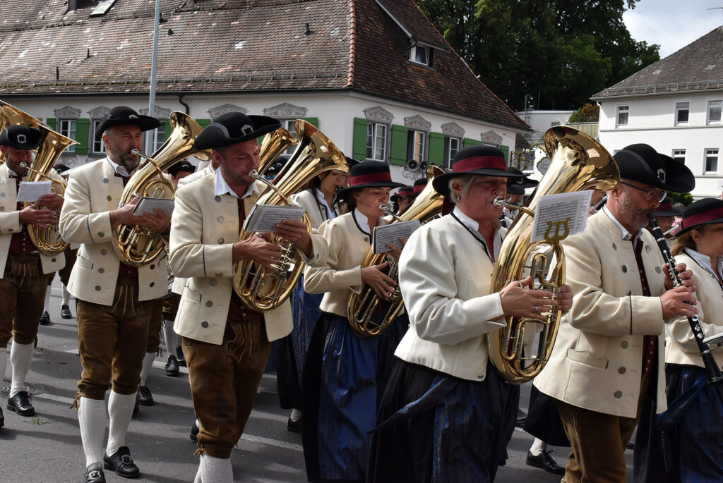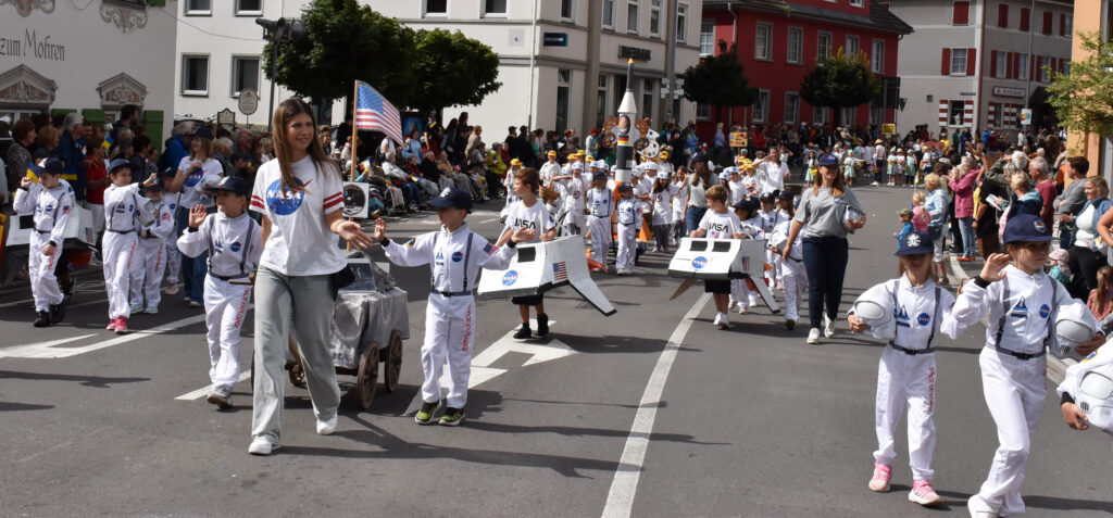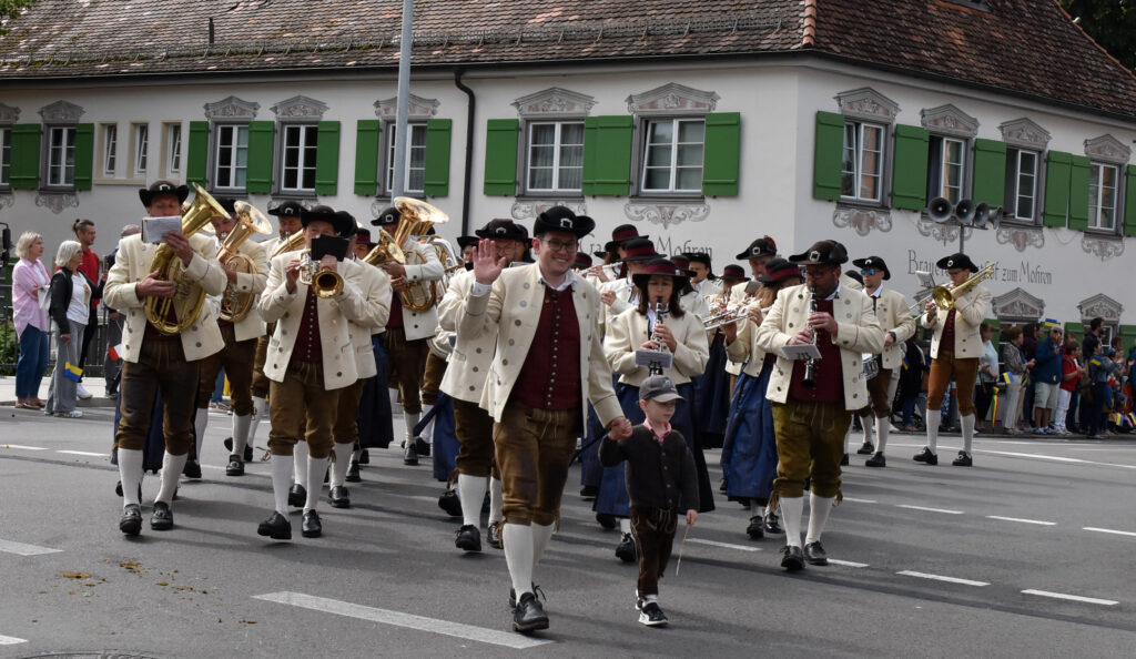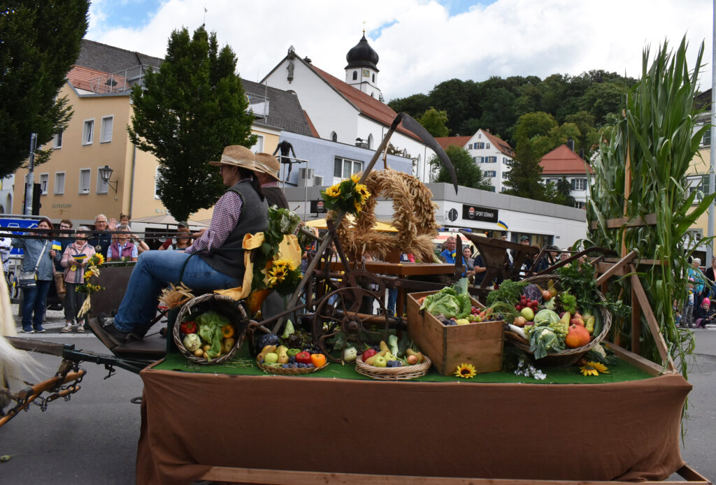 Zum Schluss kommt die Stadtkapelle – auch mit Nachwuchs an der Spitze. Dahinter der Kinderfestausschuss in Leutkircher Gewändern, natürlich sind die Kinder oder Enkel dabei, früh übt sich – das Winken und freundliche Lachen zu den vielen Gästen am Straßenrand steckt an. Die Innenstadt ist voll, alle Sitzmöglichkeiten sind ausgeschöpft, kaum einen halben Meter gibt es noch Platz zum Gucken. Mit dem Leutkircher Wappen-Wagen und herrlichen Gladiolen-Bouquets ist das Schlusslicht gesetzt – nur das DRK ist noch eine Weile präsent, ebenso Polizei und Feuerwehr. Alle anderen wandern zur Schule zurück zum Umziehen. Dann geht es Einkehren oder – vor allem für die Kinder und Jugendlichen – hinauf zur Wilhelmshöhe, wo ein Rummelplatz keine Festeswünsche offen lässt.