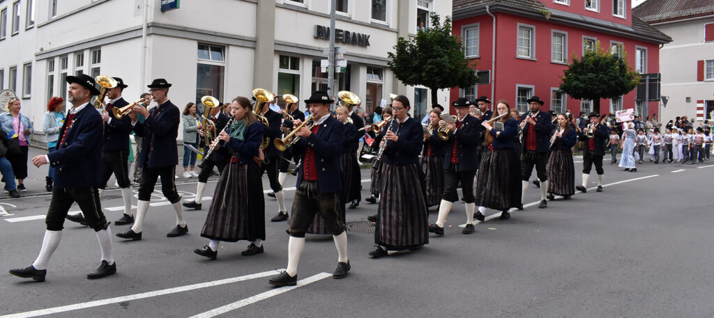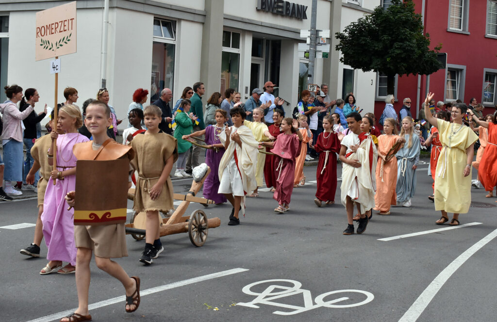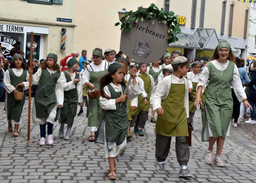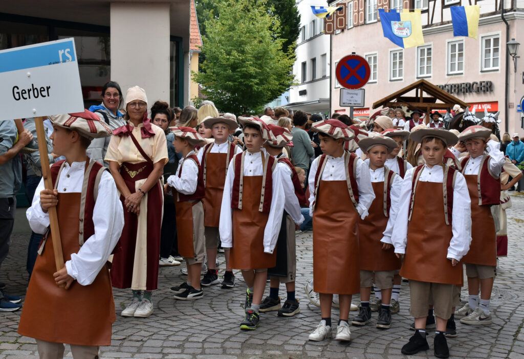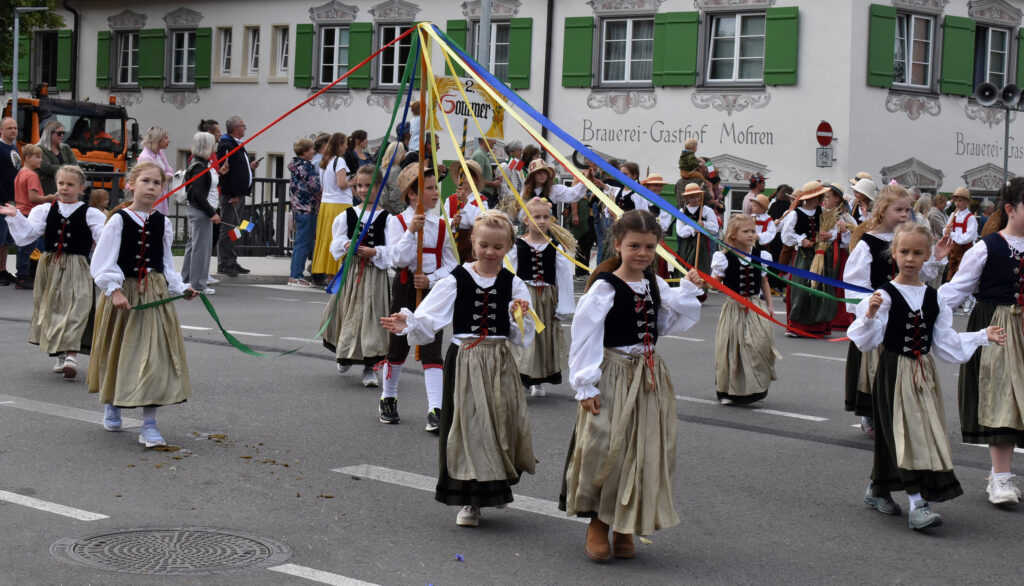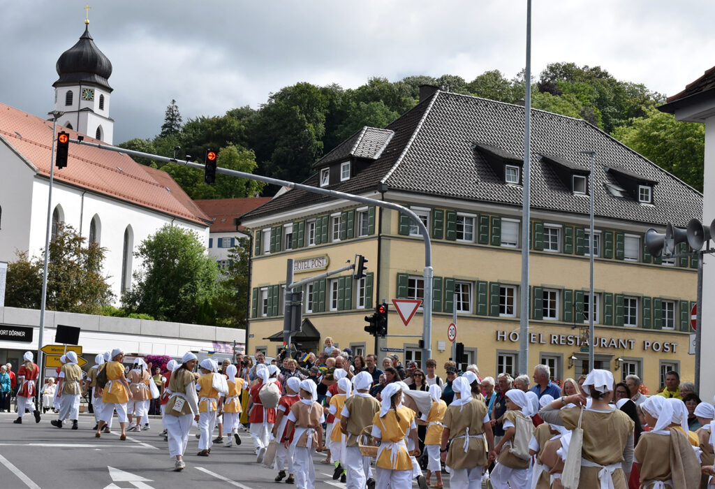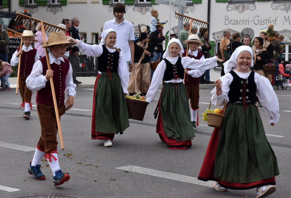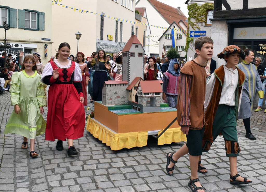 Auch die Römer waren im Allgäu, die Sieben Schwaben, viele Grundschüler zeigen das Bauernleben, symbolisieren die Jahreszeiten in hübschen Gewändern. Das älteste Haus von Leutkirch, das Gotische Haus, zeigt sich als eine historische Gruppe aus jener Zeit um 1400, die Bahnhofsgruppe ist jünger – um 1900 – mit Kleidern aus dieser Zeit, mit Koffern und Trägern, auch der hochwürdige Herr Pfarrer ist darunter. Historische Gebäude wie die Kirchen, der Bockturm oder frühere Stadttore kann man bestaunen, alles ist umrahmt und musikalisch begleitet von Musikkapellen aus den Teilgemeinden, wie die Trachtenkapelle Friesenhofen, die Musiker aus Engerazhofen und Diepoldshofen, Schloß Zeil und Merazhofen, alle sind gekommen, mit Festdamen und kräftigen Fahnenschwingern. Oft laufen die Kleinen, meist der Nachwuchs der Musikanten, vorne weg, mit geschmückten Schildern vom jeweiligen Ort. Der Leutkircher Kinderfestumzug ist ein Highlight im städtischen Jahresprogramm, sehr aufwendig vorbereitet.