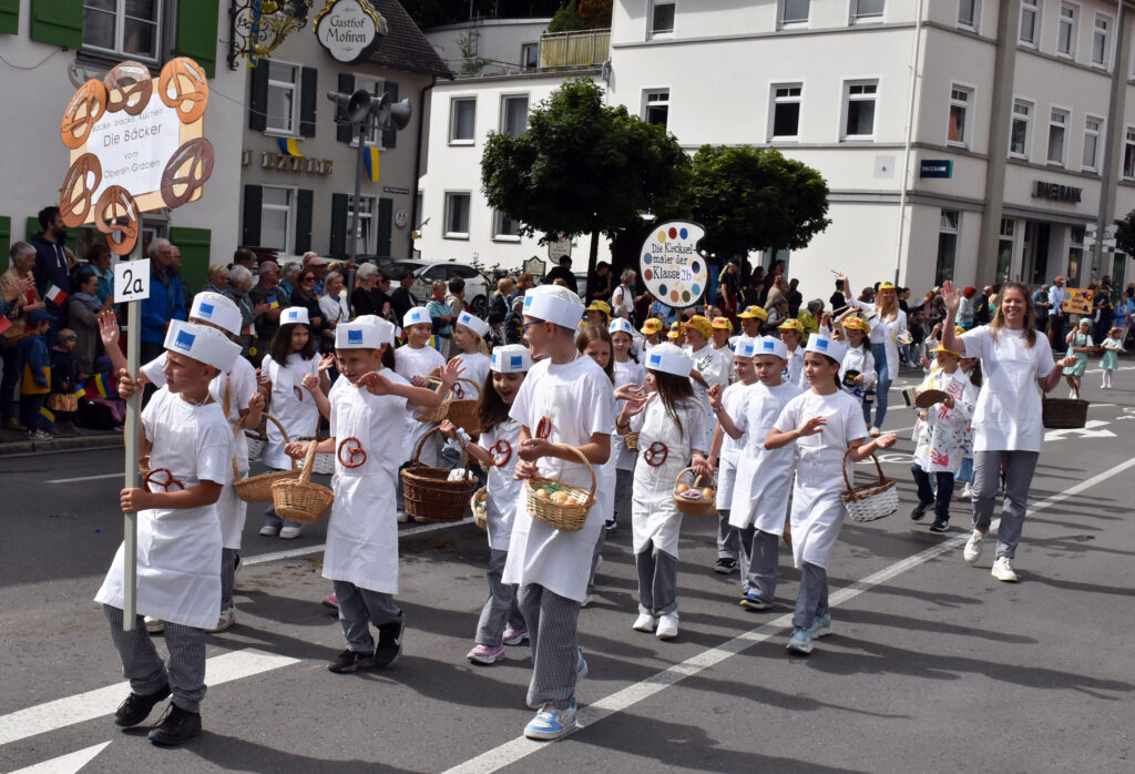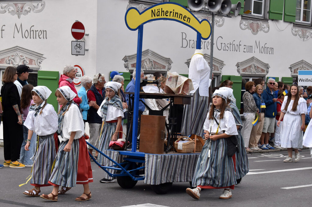 Von der Wangener Straße marschieren die Umzugsteilnehmer zur Mohren-Kreuzung, werden begeistert aufgenommen, die aufwendig geschmückten und gestalteten Festwagen mit prachtvollen Gespannen werden beklatscht. In den letzten 20 Jahren wurden sehr viele neue historische Kostüme erdacht, geplant, genäht, alles ehrenamtlich von unzähligen Frauenhänden, einst unter anderem unter Leitung von Beate Stör. Der Kinderfest-Förderverein hat inzwischen ein eigenes Näh-Studio, nebenan sind die Festwagen untergebracht. Hier kümmert sich eine Schar Männer um die Wagen, um Reparaturen oder neue Aufbauten. Ebenfalls ehrenamtlich – mit viel Freude an der Sache.