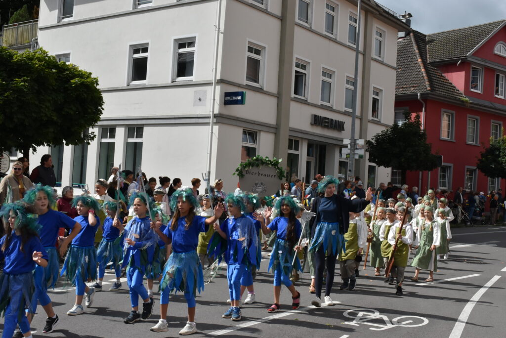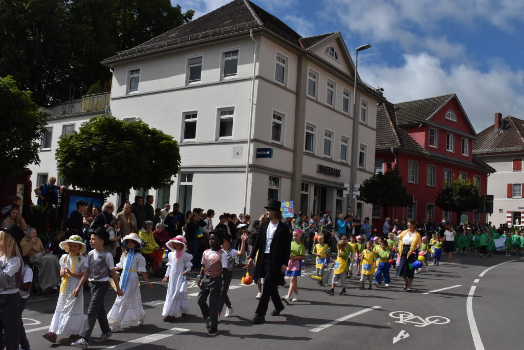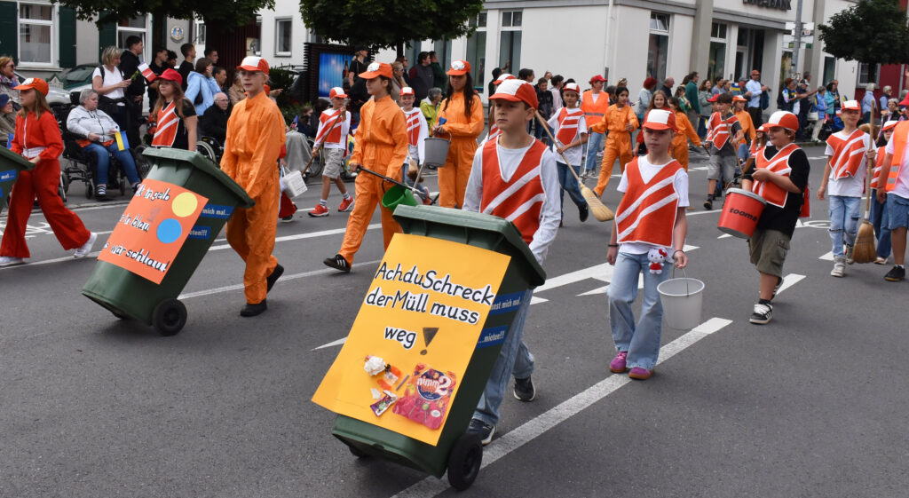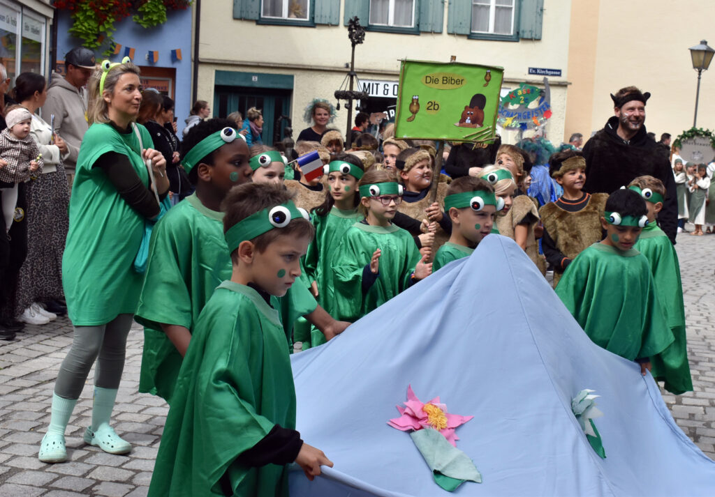 Auch die Schüler der Teilgemeinden präsentieren sich wundervoll bunt, Dornröschen, die kunstvolle Multscher-Gruppe, der lange, markante, grüne Wurm, die tiefblaue Stadtweihergruppe mit Netzen und Nixen. Da sind Maler und Müllsammler (auch das lernt man in der Schule …), das Team ums diesjährige Kinderfesttheater der schon „großen HMG-Schüler“, und alle schreien die Parole „Emil“.