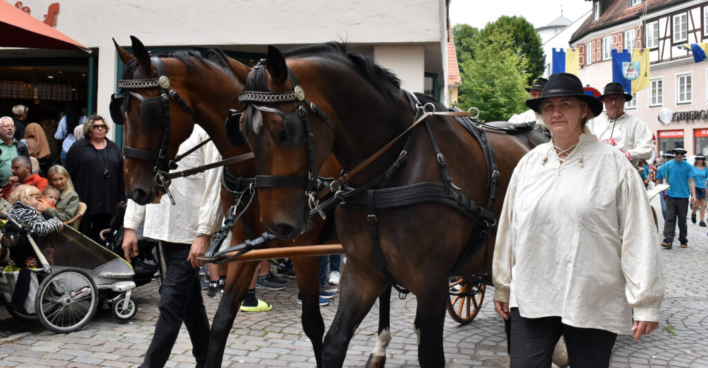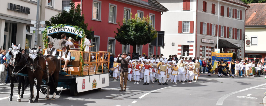 So gibt es einen fast neuen Bierbrauer-Wagen mit historischer Gruppe in neuen Gewändern, es entstand der Glasmacherwagen mit großem Schmelzofen, und auch die betuchten Glasbarone dürfen nicht fehlen. Die Gerber sind markant und berühmt für Leutkirch, gibt es doch ihnen zu Ehren die Gerbergasse. Ihr Festwagen ist voll behängt mit Fellen und Leder. Da sind die Marketenderinnen und Störleute, zeigen alte Berufe, die manch einer kaum mehr kennt, wie Besenmacher, Weißnäherinnen oder auch die flotten Landsknechte in wunderschönen blau-rot-weißen Uniformen – alles selbst genäht, nichts ist einfach online bestellt. Dieser historische Umzug ist handgemacht, mit viel Liebe zum Detail.