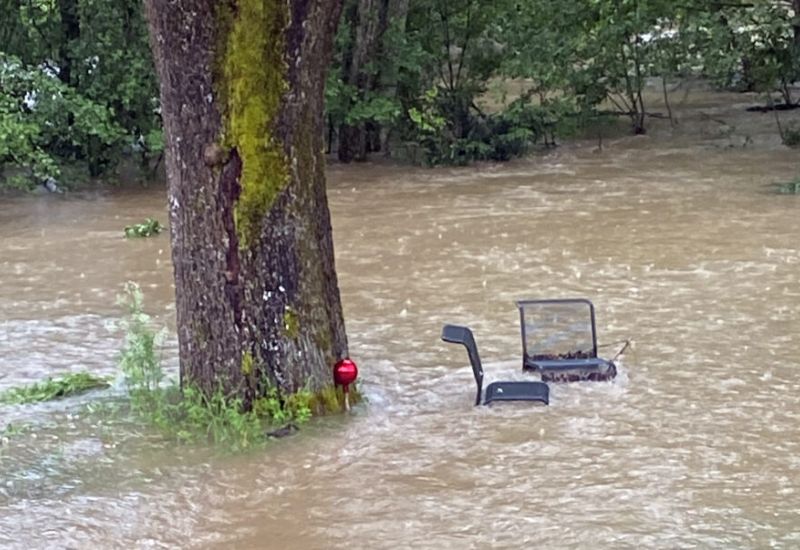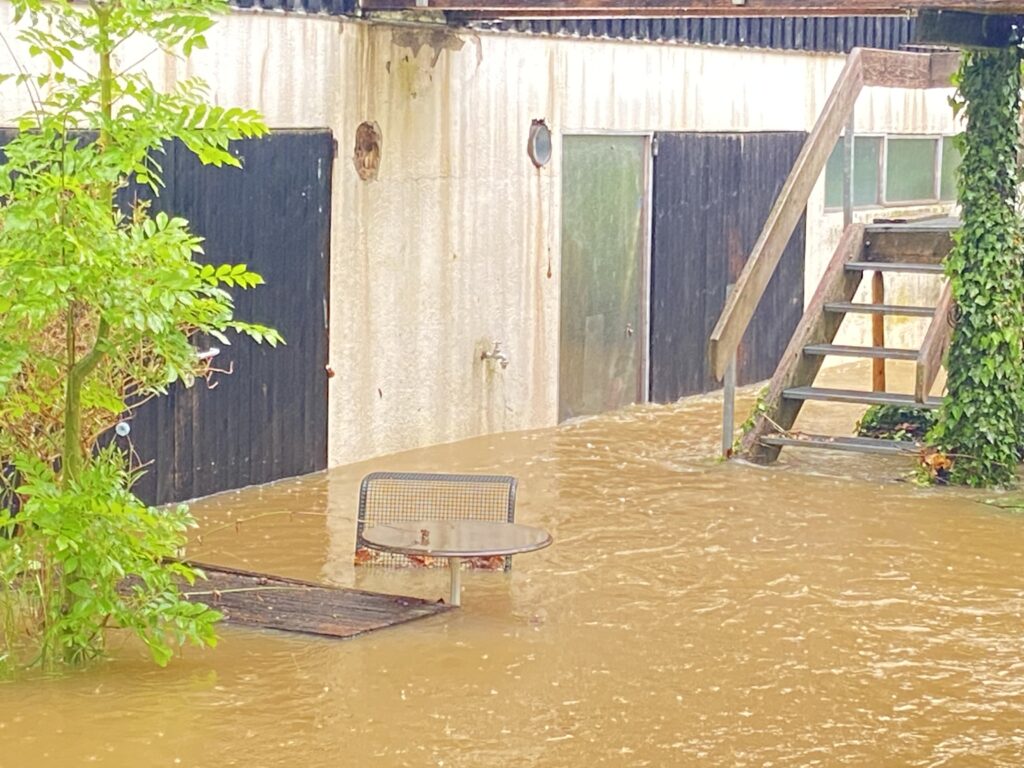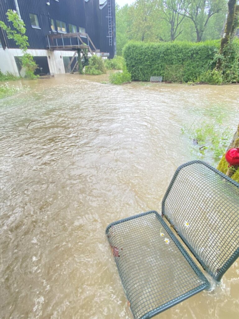 1. Juni gegen 8.00 Uhr nahe Haus Rotis 5-2: Die Freiluft-Sitzgruppe heute nur zum Fußbad geeignet.