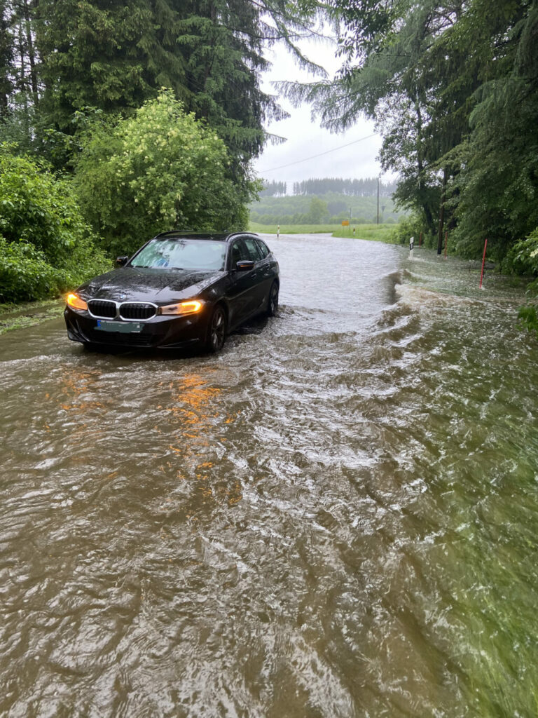 1. Juni gegen 9.00 Uhr: Kreisstraße Leutkirch – Legau: Hängengebliebener BMW mit vom Wasser geschädigter Automatik. Fossiles Fahrzeug in Zeiten des Klimawandels?
