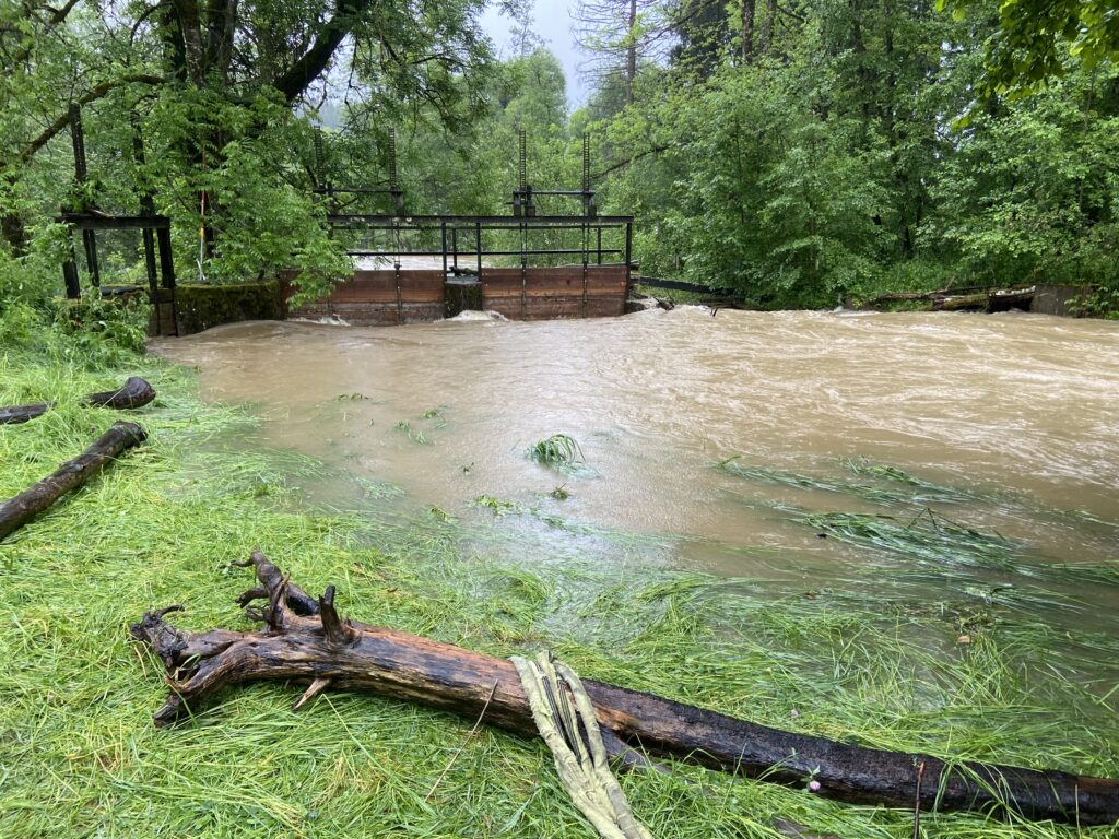 Samstag, 1. Juni, gegen 9.00 Uhr: Bisher stehen sie – die Stauwehr-Anlage und die Uferdämme des Wasserkraftwerks Rotismühle. Offenbar hochwasserentlastend: das hier nicht sichtbare „Klappenwehr“ unter den Fluten rechts der Stauwehr-Staufallen. Das Klappenwehr ließ Julian Aicher 2012 bis 2024 nach Anraten von Diplomingenieur Josef Dennenmoser aus Uttenhofen dort einbauen (mit viel Eigenleistung).