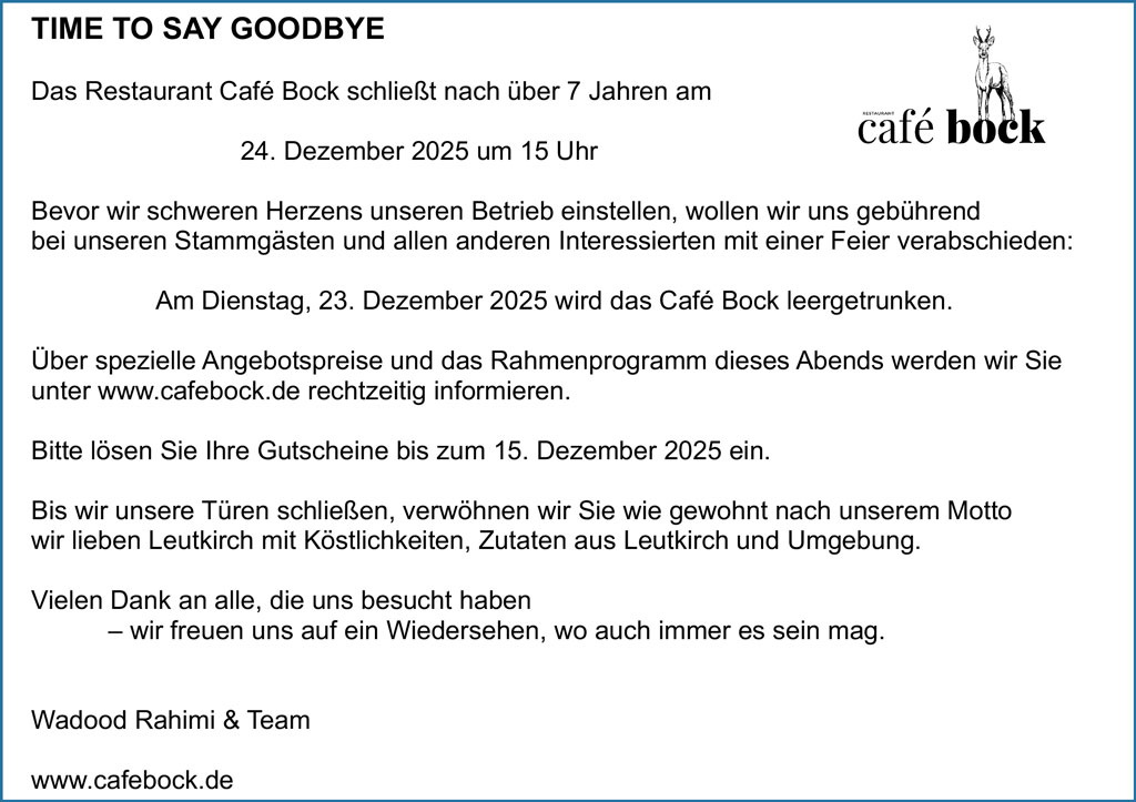 Ähnlich wie das „Oberem” sieht auch das „Café Bock” sein Ende unter bisheriger Leitung nahe. Wadood Rahimi hat das helle Lokal seit 2018 zu einem Restaurant ausgebaut, in dem sich sowohl international schmackhafte als auch schwäbische Küche genießen lässt. Siehe dazu auch den Bericht in der Bildschirmzeitung vom 8. April 2024: https://www.diebildschirmzeitung.de/allgaeu-oberschwaben/leutkirch/heute-cafe-bock-46533/ Jetzt macht er Schluss. Und zwar genau am 24. Dezember um 15.00 Uhr. Einen Tag zuvor werde das weiße Wirtshaus „leergetrunken”. Seiner genussfreudigen Kundschaft möchte Wadood Rahimi derweil treu bleiben. Dazu Genaues demnächst hier in der Bildschirmzeitung.