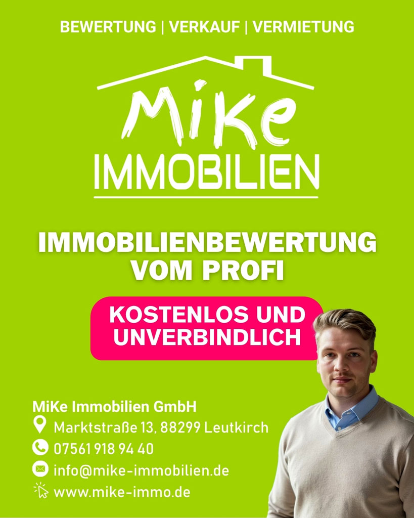 Wer sich über neue Behausungen Gedanken macht, findet bei „Mike Immobilien” vieles. Dabei arbeitet die zweiköpfige Firma einerseits von Leutkirch aus, andererseits von Lichtenstein bei Reutlingen. So kennt „Mike Immobilien” seit 2015 eine ganze Region – mit weitem Blick. Seit 2021 gar zwei Gegenden. Von der Etagenwohnung in Lichtenstein am Rand der Schwäbischen Alb bis zum Zweifamilienhaus in Altusried. Mit mehreren Offerten wartet „Mike”-Immobilien“ zudem direkt zu Leutkirch selbst auf. Die Marktstraße Leutkirch – auch in Sachen Immobilien mobil aktiv.