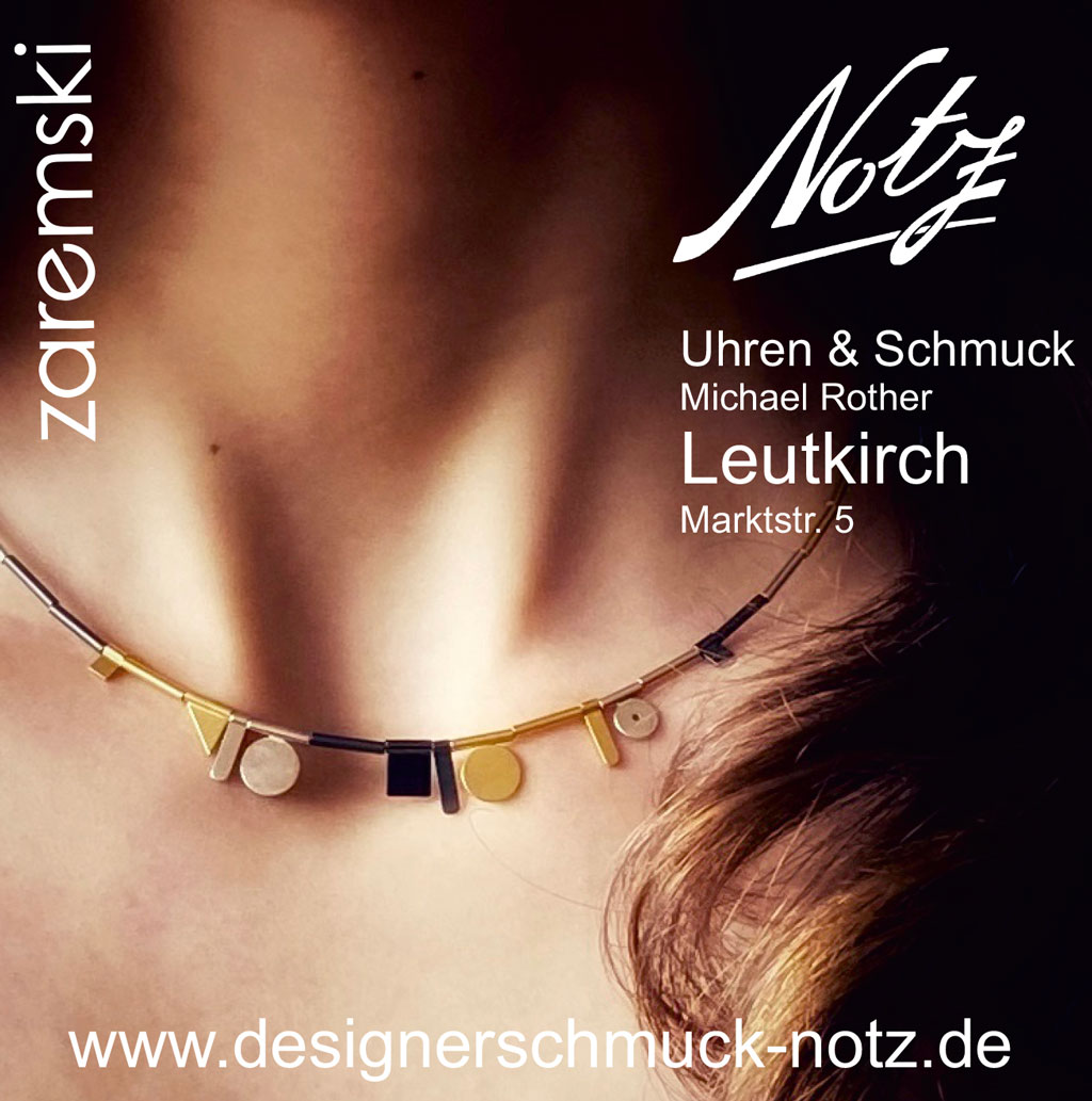 „Unser Onlineshop „www.designerschmuck-notz.de“ wurde speziell für diesen besonderen, handgearbeiteten Schmuck geschaffen, dort können die meisten Artikel auch vorab besichtigt oder gleich bestellt werden.“ Gerne erarbeitet „Notz” auch Schmuckstücke nach Vorgaben der Kundschaft. Und zwar „entweder direkt in der eigenen Werkstatt oder in Zusammenarbeit mit verbundenen Goldschmieden”. So führt Notz auch Uhren im Sortiment, „die von ausgesuchten deutschen Manufakturen hergestellt werden.“  So etwa die Uhren der Marken Bauhaus und Zeppelin, die in München gefertigt werden, „Rolf Cremer“ aus Norddeutschland oder „Bruno Söhnle“ aus Glashütte. Stets offeriert mit bewährtem Service. Bis hin zum Ohrlochstechen. Selbstverständlich werden auch Reparaturen angeboten.