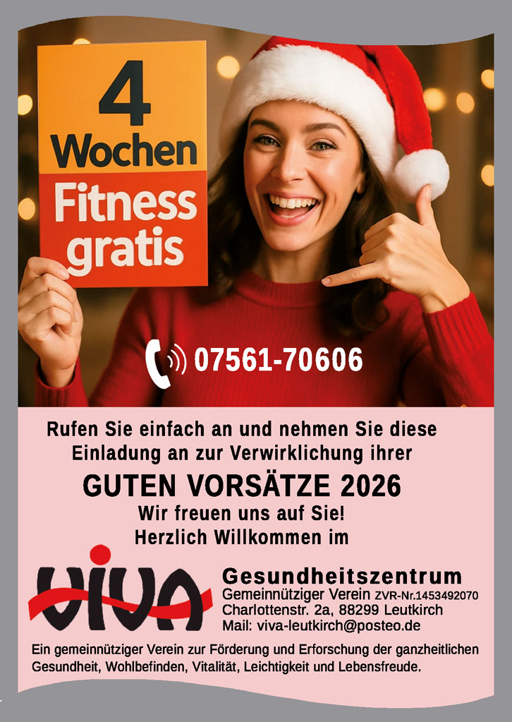 Die Leutkircher Innenstadt. Ihre Geschäftswelt zeigt Bewegung. Die Kernstadt ist ein Ort vieler Möglichkeiten. Gerade beim Geschenke-Kauf. Etwa Gutscheine. Zum Beispiel für den regelmäßigen Besuch eines Fitness-Angebots. Passend zu den guten Vorsätzen zum Jahresbeginn 2026 für ein besseres Leben. Das „Viva Sport- und Gesundheitszentrum” an der Charlottenstraße 2 a (nahe Wangener Straße) macht schon seit mehreren Jahrzehnten Freude. Weniger mit „modernem Schnickschnack” als viel mehr mit bewährten Bewegungsgerät. Plus gemütlicher Atmosphäre. So ansehnlich kann Gesundheit wirken.