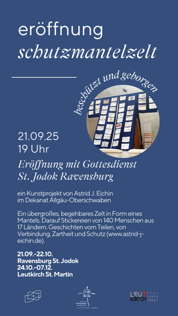 In St. Jodok in Ravensburg ist ein begehbares Schutzmantelzelt aufgestellt. Darauf sind Stickereien von 140 Menschen aus 17 Ländern zu sehen. Geschichten vom Teilen, von Verbindung, Zartheit und Schutz. Ein Kunstprojekt von Astrid J. Eichin. In St. Jodok zu sehen bis 22. Oktober. Anschließend kommt das Schutzmantelzelt nach Leutkirch und wird in St. Martin ausgestellt (24. Oktober bis 7. Dezember).